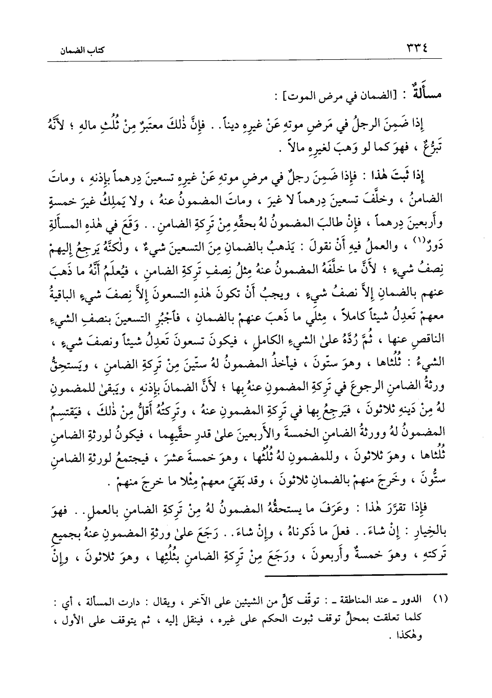 إذا ثبت هذا: فإذا ضمن رجل في مرض موته عن غيره تسعين درهما بإذنه، ومات الضامن، وخلف تسعين درهما لا غير، ومات المضمون عنه، ولا يملك غير خمسة وأربعين درهما، فإن طالب المضمون له بحقه في تركة الضامن، وقع في هذه المسألة دور، والعمل فيه أن نقول: يذهب بالضمان من التسعين شيء، ولكنه يرجع إليهم نصف شيء؛ لأن ما خلفه المضمون عنه مثل نصف تركة الضامن فيعلم أنه ما ذهب عنهم بالضمان إلا نصف شيء، ويجب أن تكون هذه التسعون إلا نصف شيء الباقية معهم تعدل شيئا كاملا، مثلي ما ذهب عنهم بالضمان، فاجبر التسعين بنصف الشيء الناقص عنها، ثم رده على الشيء الكامل، فيكون تسعون تعدل شيئا ونصف شيء، الشيء ثلثاها، وهو ستون، فيأخذ المضمون له ستين من تركة الضامن، ويستحق ورثة الضامن الرجوع في تركة المضمون عنه بها؛ لأن الضمان بإذنه، ويبقى للمضمون له من دينه ثلاثون، فيرجع بها في تركة المضمون عنه، وتركته أقل من ذلك، فيقتسم المضمون له وورثة الضامن الخمسة والأربعين على قدر حقيهما، فيكون لورثة الضامن ثلثاها، وهو ثلاثون، وللمضمون له ثلثها، وهو خمسة عشر، فيجتمع لورثة الضامن ستون، وخرج منهم بالضمان ثلاثون، وقد بقي معهم مثلا ما خرج منهم.