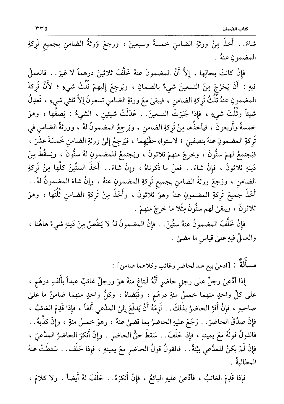 فإن كانت بحالها، إلا أن المضمون عنه خلف ثلاثين درهما لا غير.. فالعمل فيه: أن يخرج من التسعين شيء بالضمان، ويرجع إليهم ثلث شيء؛ لأن تركة المضمون عنه ثلث تركة الضامن، فيبقى مع ورثة الضامن تسعون إلا ثلثي شيء، تعدل شيئا وثلث شيء، فإذا جبرت التسعين.. عدلت شيئين، الشيء: نصفها، وهو خمسة وأربعون، فيأخذها من تركة الضامن، ويرجع المضمون له، وورثة الضامن في تركة المضمون عنه بنصفين؛ لاستواء حقيهما، فيرجع إلى ورثة الضامن خمسة عشر، فيجتمع لهم ستون، وخرج منهم ثلاثون، ويجتمع للمضمون له ستون، ويسقط من دينه ثلاثون، فإن شاء.. فعل ما ذكرناه، وإن شاء.. أخذ الستين كلها من تركة الضامن، ورجع ورثة الضامن بجميع تركة المضمون عنه، وإن شاء المضمون له.. أخذ جميع تركة المضمون عنه وهو ثلاثون، وأخذ من تركة الضامن ثلثها، وهو ثلاثون، ويبقى لهم ستون مثلا ما خرج منهم.