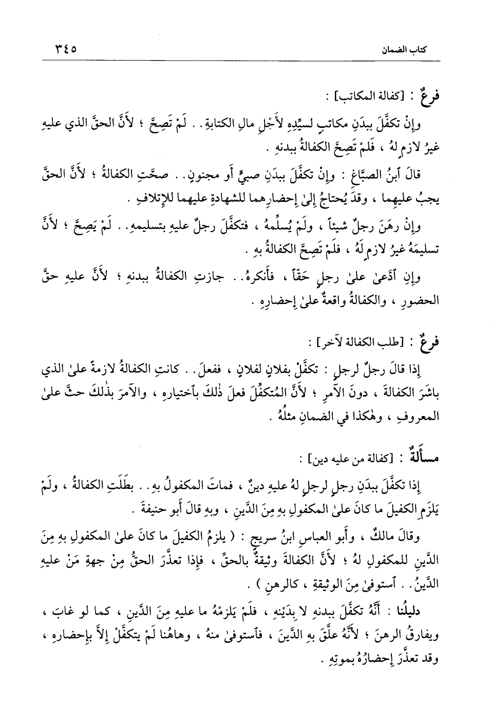 ] : إذ قال رجل لرجل: تكفل بفلان لفلان، ففعل.. كانت الكفالة لازمة على الذي باشر الكفالة، دون الآمر؛ لأن المتكفل فعل ذلك باختباره، والآمر بذلك حث على المعروف، وهكذا في الضمان مثله.