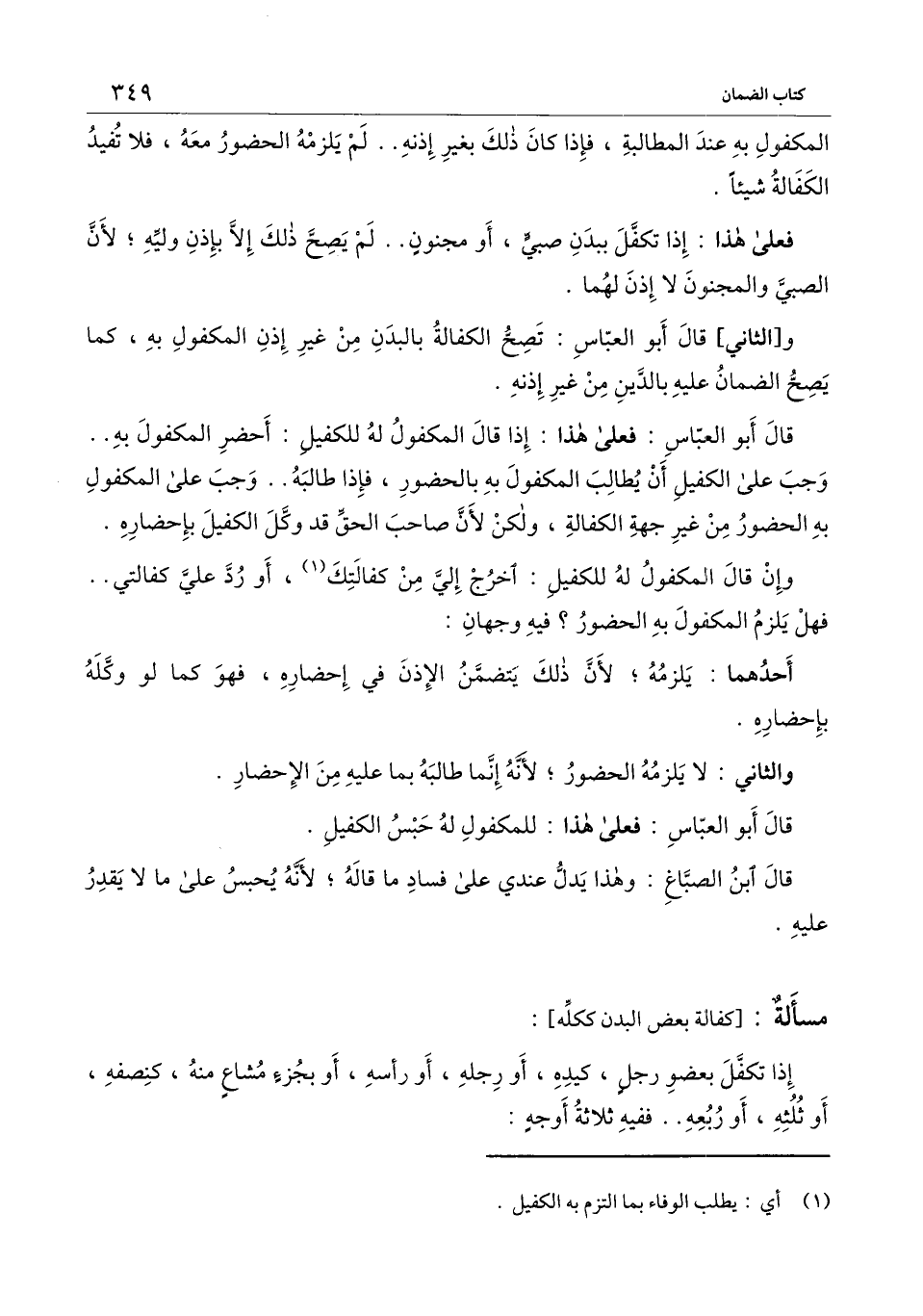 ] : إذا تكفل بعضو رجل، كيده، أو رجله، أو رأسه، أو بجزء مشاع منه، كنصفه، أو ثلثه، أو ربعه.. ففيه ثلاثة أوجه: