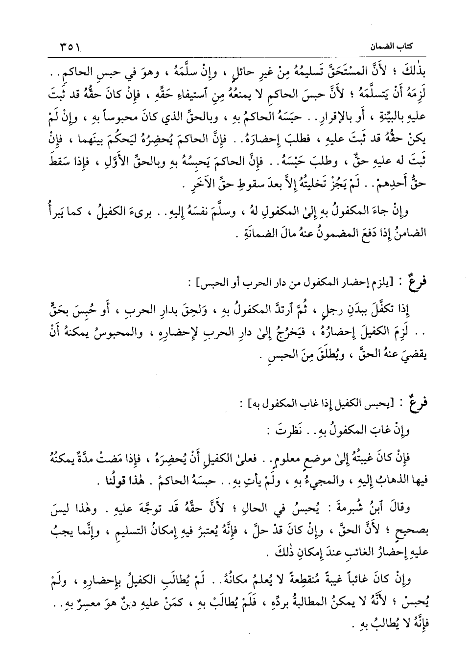 ] : إذا تكفل ببدن رجل، ثم ارتد المكفول به، ولحق بدار الحرب، أو حبس بحق.. لزم الكفيل إحضاره، فيخرج إلى دار الحرب لإحضاره، والمحبوس يمكنه أن يقضي عنه الحق، ويطلق من الحبس.
