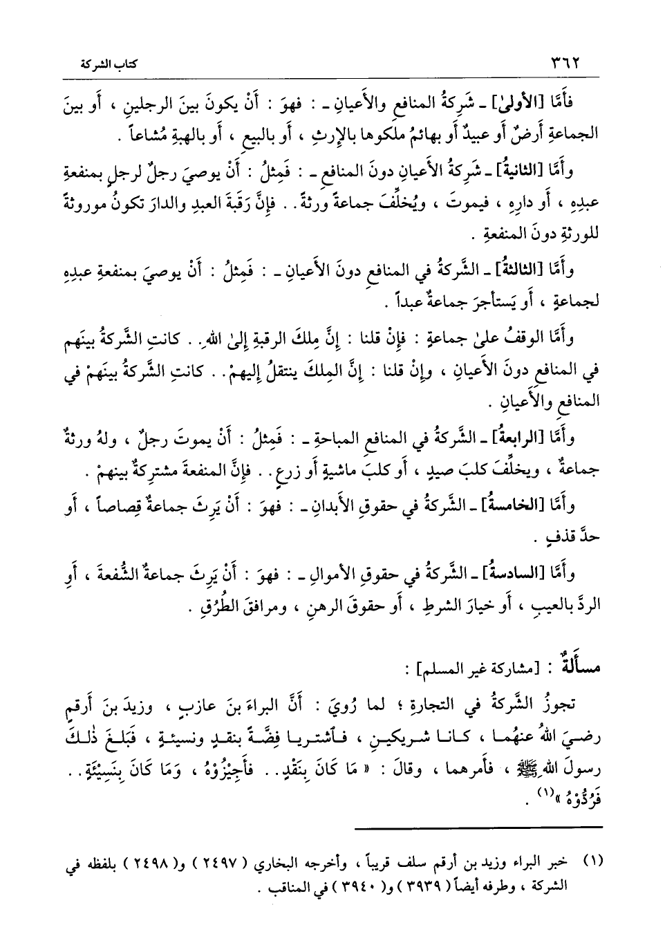 وأما [السادسة]- الشركة في حقوق الأموال -: فهو: أن يرث جماعة الشفعة، أو الرد بالعيب، أو خيار الشرط، أو حقوق الرهن، ومرافق الطرق.