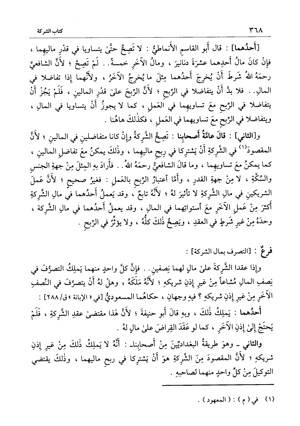 ] : وإذا عقدا الشركة على مال لهما نصفين.. فإن كل واحد منهما يملك التصرف في نصف المال مشاعا من غير إذن شريكه؛ لأنه ملكه، وهل له أن يتصرف في النصف الآخر من غير إذن شريكه؟ فيه وجهان؛ حكاهما المسعودي [في " الإبانة " ق \ 288] :