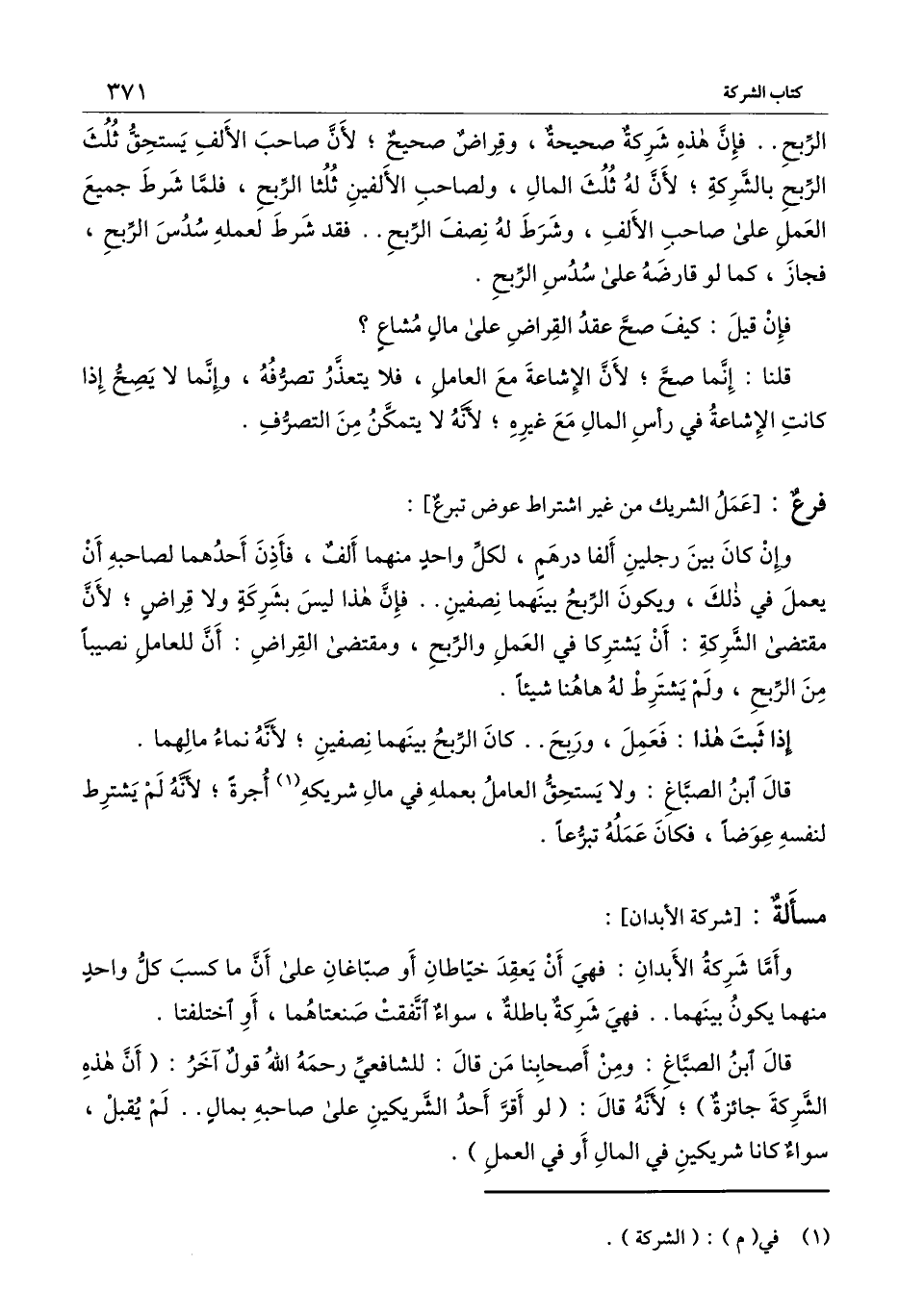 فإن قيل: كيف صح عقد القراض على مال مشاع؟ قلنا: إنما صح؛ لأن الإشاعة مع العامل، فلا يتعذر تصرفه، وإنما لا يصح إذا كانت الإشاعة في رأس المال مع غيره؛ لأنه لا يتمكن من التصرف.