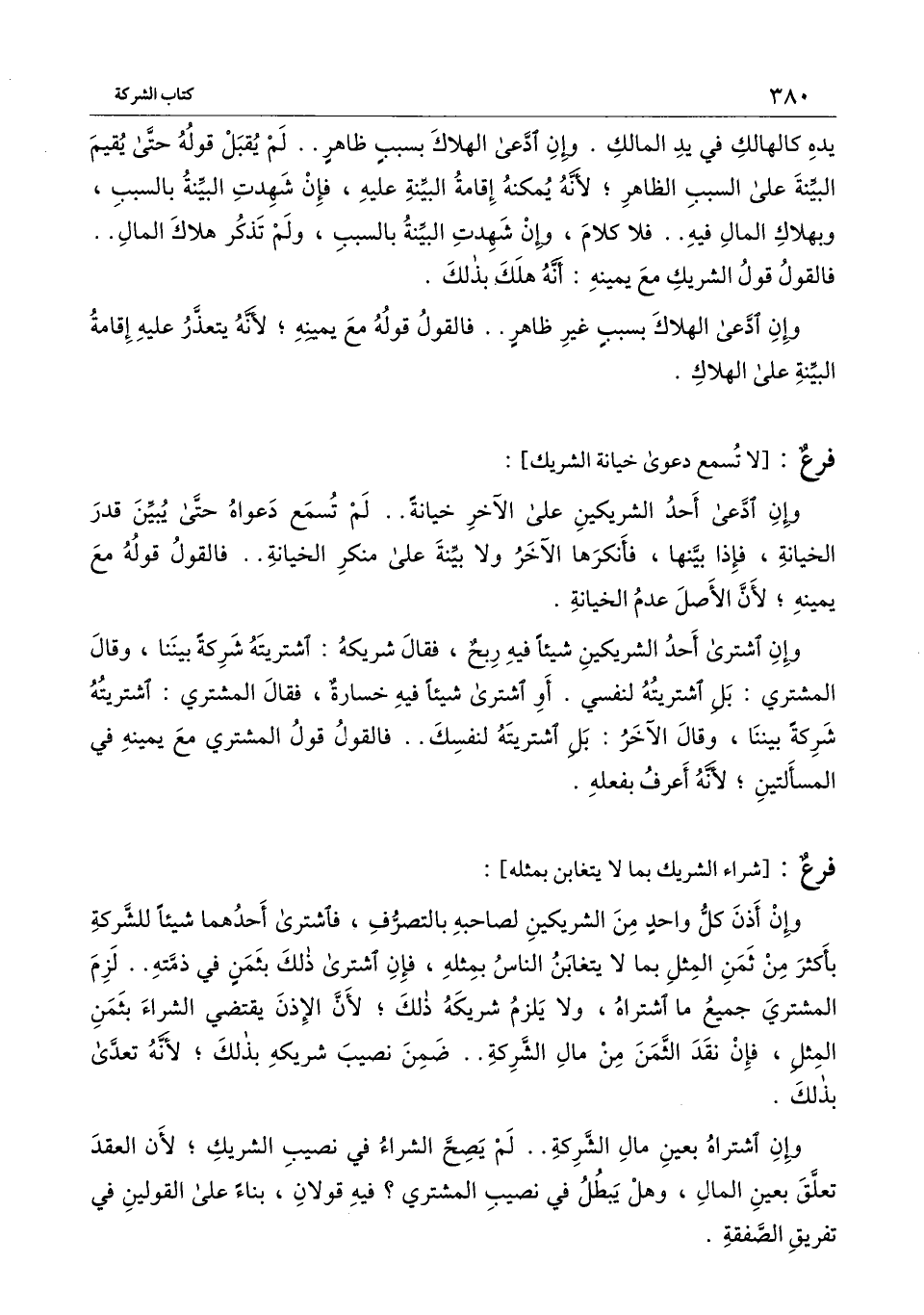 يده كالهالك في يد المالك. وإن ادعى الهلاك بسبب ظاهر.. لم يقبل قوله حتى يقيم البينة على السبب الظاهر؛ لأنه يمكنه إقامة البينة عليه، فإن شهدت البينة بالسبب، وبهلاك المال فيه.. فلا كلام، وإن شهدت البينة بالسبب، ولم تذكر هلاك المال.. فالقول قول الشريك مع يمينه: أنه هلك بذلك.