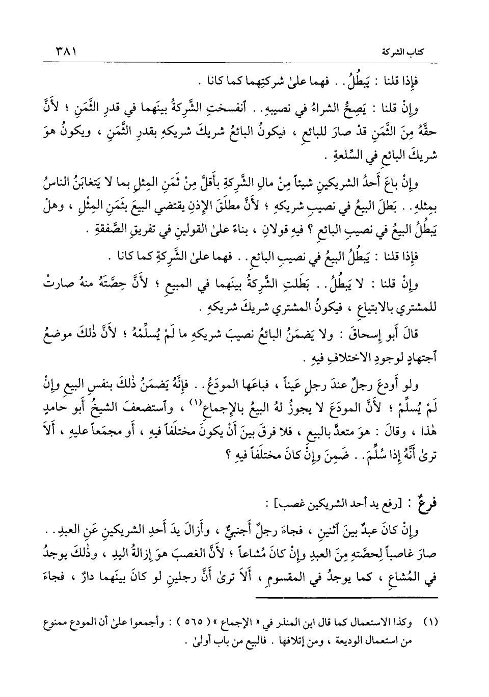 وإن قلنا: يصح الشراء في نصيبه.. انفسخت الشركة بينهما في قدر الثمن؛ لأن حقه من الثمن قد صار للبائع؛ فيكون البائع شريك شريكه بقدر الثمن، ويكون هو شريك البائع في السلعة.