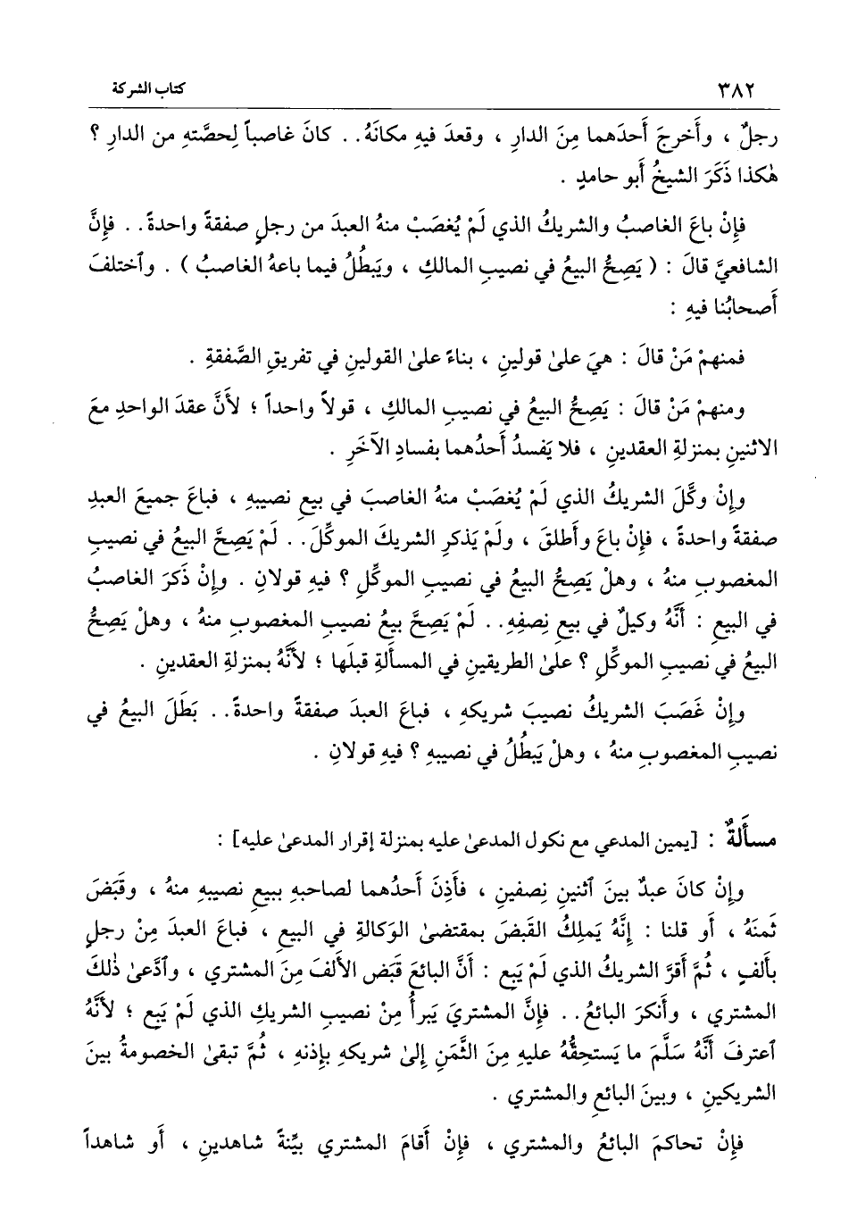 ] : وإن كان عبد بين اثنين نصفين، فأذن أحدهما لصاحبه ببيع نصيبه منه، وقبض ثمنه، أو قلنا: إنه يملك القبض بمقتضى الوكالة في البيع، فباع العبد من رجل بألف، ثم أقر الشريك الذي لم يبع.. أن البائع قبض الألف من المشتري، وادعى ذلك المشتري، وأنكر البائع.. فإن المشتري يبرأ من نصب الشريك الذي لم يبع؛ لأنه اعترف أنه سلم ما يستحقه عليه من الثمن إلى شريكه بإذنه، ثم تبقى الخصومة بين الشريكين، وبين البائع والمشتري.