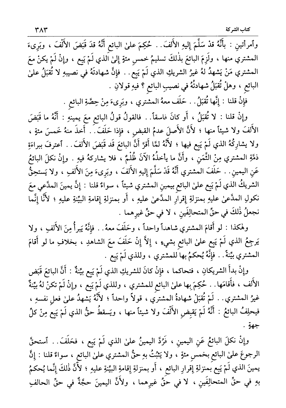وإن قلنا: لا تقبل، أو كان فاسقا.. فالقول قول البائع مع يمينه: أنه ما قبض الألف ولا شيئا منها؛ لأن الأصل عدم القبض، فإذا حلف.. أخذ منه خمسمائة، ولا يشاركه الذي لم يبع فيها؛ لأنه لما أقر أن البائع قد قبض الألف.. اعترف ببراءة ذمة المشتري من الثمن، وأن ما يأخذه الآن ظلم، فلا يشاركه فيه، وإن نكل البائع عن اليمين.. حلف المشتري أنه قد سلم إليه الألف، وبرئ من الألف، ولا يستحق الشريك الذي لم يبع على البائع بيمين المشتري شيئا، سواء قلنا: إن يمين المدعي مع نكول المدعى عليه بمنزلة إقرار المدعى عليه، أو بمنزلة إقامة البينة عليه؛ لأنا إنما نجعل ذلك في حق المتحالفين، لا في حق غيرهما.