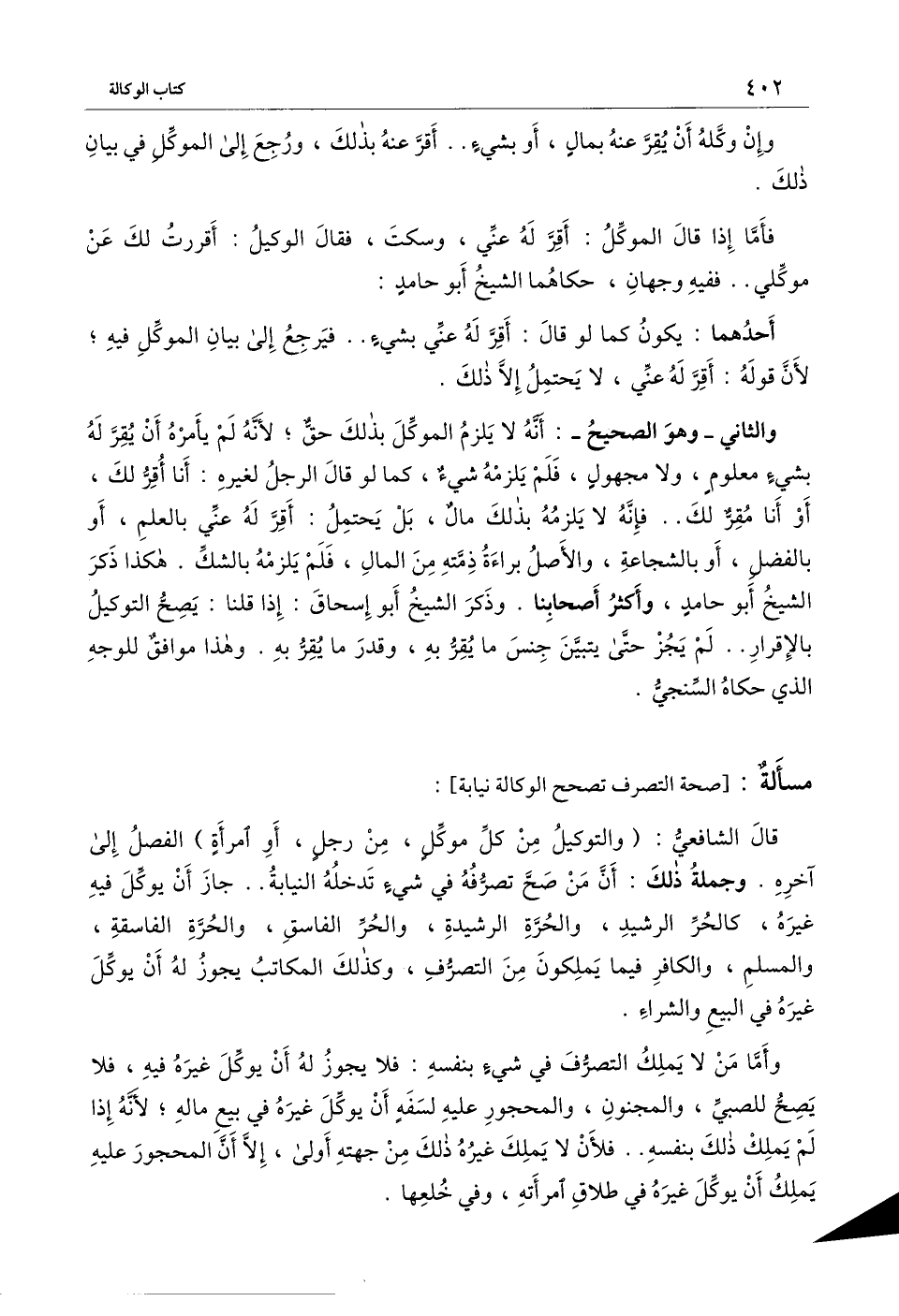 والثاني ـ وهو الصحيح ـ: أنه لا يلزم الموكل بذلك حق؛ لأنه لم يأمره أن يقر له بشيء معلوم، ولا مجهول، فلم يلزمه شيء، كما لو قال الرجل لغيره: أنا أقر لك، أو أنا مقر لك.. فإنه لا يلزمه بذلك مال، بل يحتمل: أقر له عني بالعلم، أو بالفضل، أو بالشجاعة، والأصل براءة ذمته من المال، فلم يلزمه بالشك. هكذا ذكر الشيخ أبو حامد، وأكثر أصحابنا. وذكر الشيخ أبو إسحاق: إذا قلنا: يصح التوكيل بالإقرار.. لم يجز حتى يتبين جنس ما يقر به، وقدر ما يقر به. وهذا موافق للوجه الذي حكاه السنجي.