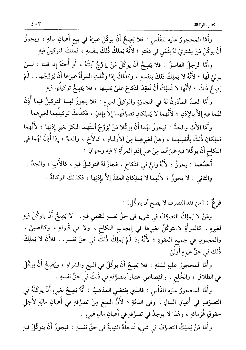 ] : ومن لا يملك التصرف في شيء في حق نفسه لنقص فيه.. لا يصح أن يتوكل فيه لغيره، كالمرأة لا تتوكل لغيرها في إيجاب النكاح، ولا في قبوله، وكالصبي، والمجنون في جميع العقود؛ لأنه إذا لم يملك ذلك في حق نفسه.. فلأن لا يملك ذلك في حق غيره أولى.