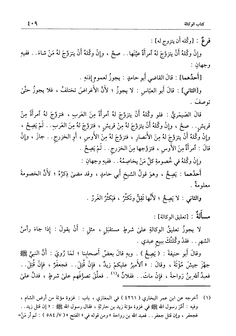 قال الصيمري فلو وكله أن يتزوج له امرأة من العرب، فتزوج له امرأة من قريش.. صح، وإن وكله أن يتزوج له من قريش، فتزوج له من العرب.. لم يصح، وإن وكله أن يتزوج له من الأنصار، فتزوج له من الأوس، أو الخزرج،.. جاز، وإن قال: امرأة من الأوس، فتزوجها من الخزرج.. لم يصح.
