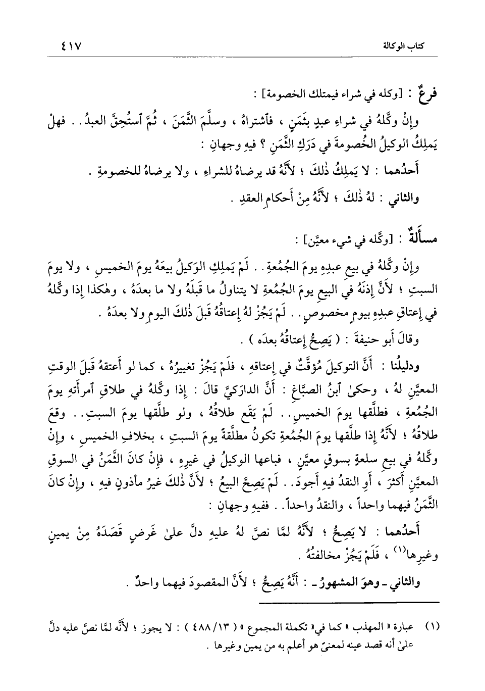 ودليلنا: أن التوكيل مؤقت في إعتاقه، فلم يجز تغييره، كما لو أعتقه قبل الوقت المعين له، وحكى ابن الصباغ: أن الداركي قال: إذا وكله في طلاق امرأته يوم الجمعة، فطلقها يوم الخميس.. لم يقع طلاقه، ولو طلقها يوم السبت.. وقع طلاقه؛ لأنه إذا طلقها يوم الجمعة تكون مطلقة يوم السبت، بخلاف الخميس، وإن وكله في بيع سلعة بسوق معين، فباعها الوكيل في غيره، فإن كان الثمن في السوق المعين أكثر، أو النقد فيه أجود.. لم يصح البيع؛ لأن ذلك غير مأذون فيهن وإن كان الثمن فيهما واحدا، والنقد واحدا.. ففيه وجهان: