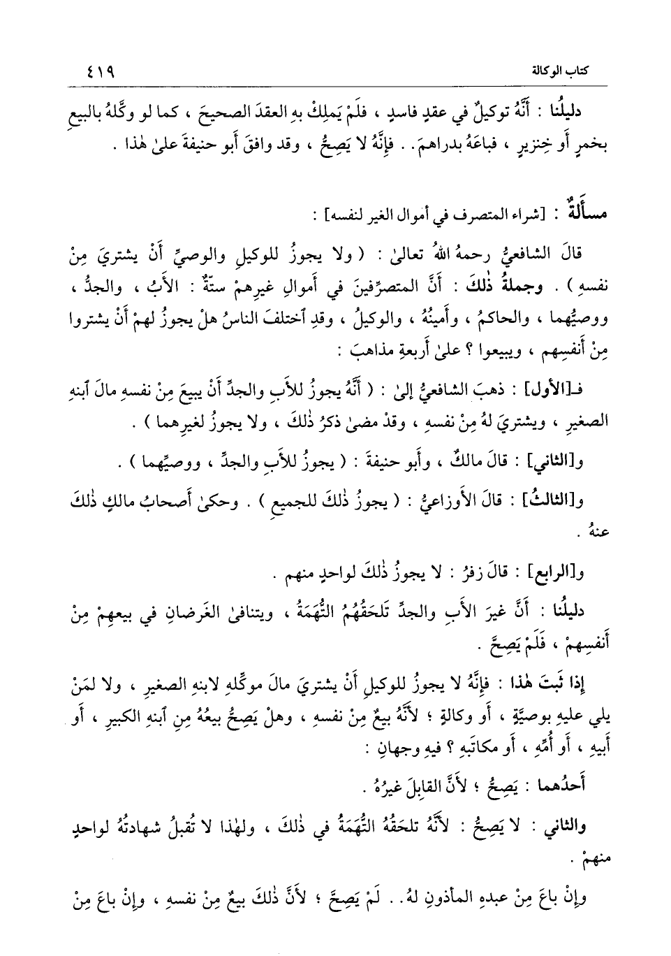ف [الأول] : ذهب الشافعي إلى: (أنه يجوز للأب والجد أن يبيعا من نفسه مال ابنه الصغير ويشتري له من نفسه، وقد مضى ذكر ذلك، ولا يجوز لغيرهما) .