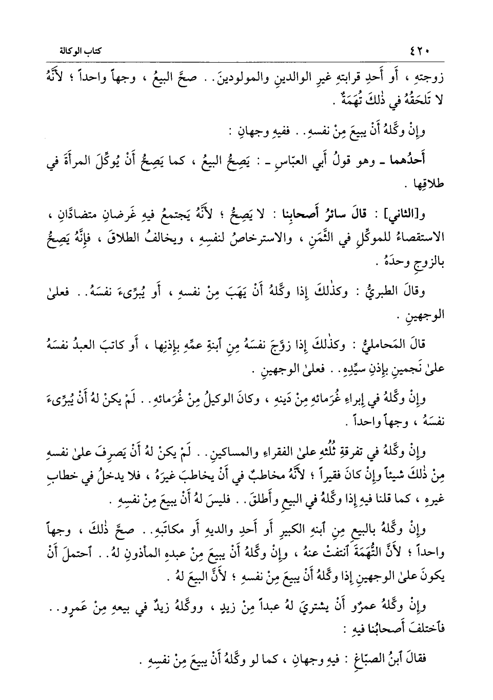 و [الثاني] : قال سائر أصحابنا لا يصح؛ لأنه يجتمع فيه غرضان متضادان، الاستقصاء للموكل في الثمن والاسترخاص لنفسه، ويخالف الطلاق، فإنه يصح بالزوج وحده.