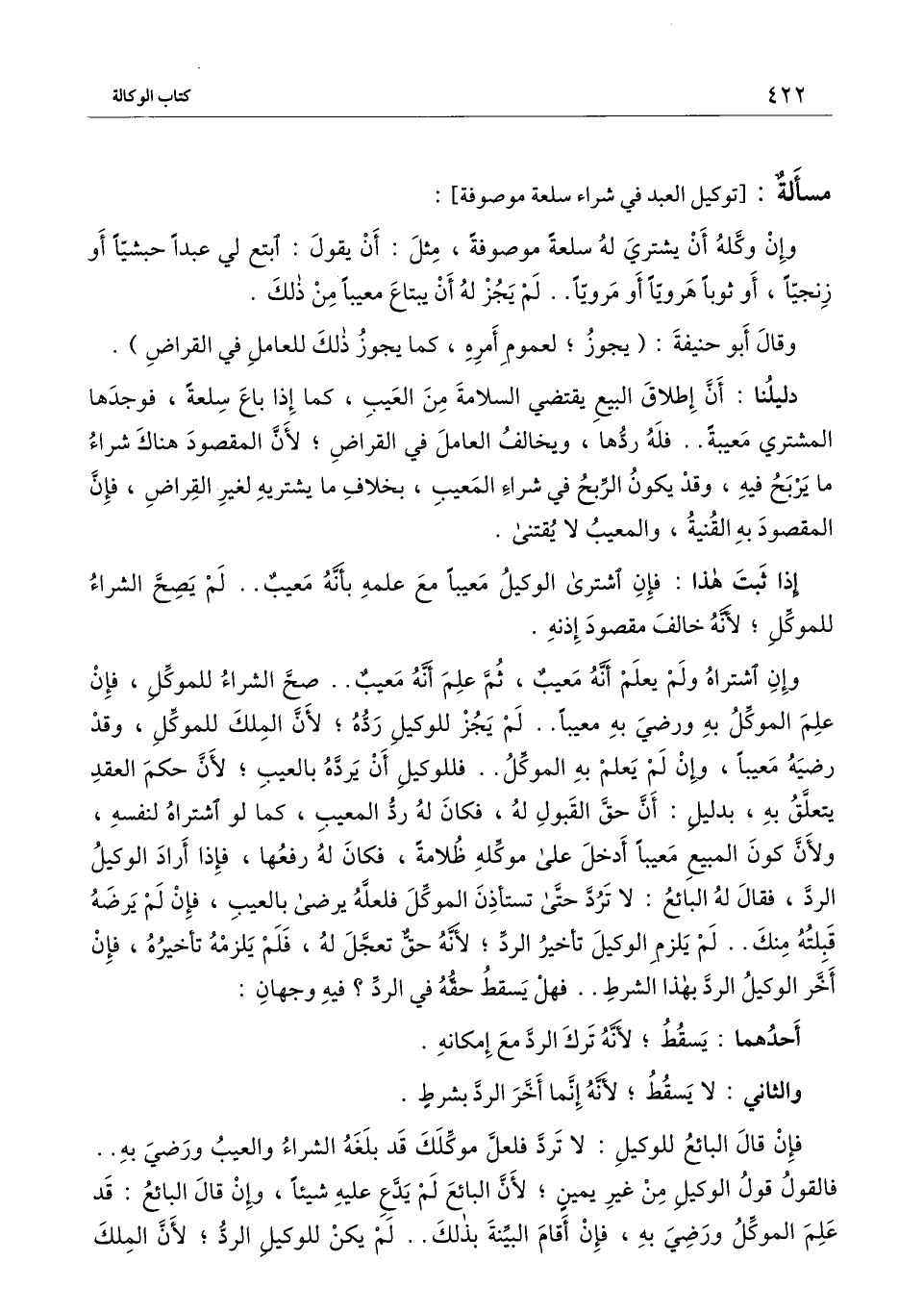 وإن اشتراه ولم يعلم أنه معيب، ثم علم أنه معيب.. صح الشراء للموكل، فإن علم الموكل به ورضي به معيبا.. لم يجز للوكيل رده؛ لأن الملك للموكل، وقد رضيه معيبا، وإن لم يعلم به الموكل.. فللوكيل أن يرده بالعيب؛ لأن حكم العقد يتعلق به، بدليل: أن حق القبول له، فكان له رد المعيب كما لو اشتراه لنفسه، ولأن كون المبيع معيبا أدخل على موكله ظلامة، فكان له رفعها، فإذا أراد الوكيل الرد، فقال له البائع: لا ترد حتى تستأذن الموكل فلعله يرضى بالعيب، فإن لم يرضه قبلته منك.. لم يلزم الوكيل تأخير الرد؛ لأنه حق تعجل له فلم يلزمه تأخيره، فإن أخر الوكيل الرد بهذا الشرط فهل يسقط حقه في الرد؟ ففيه وجهان: