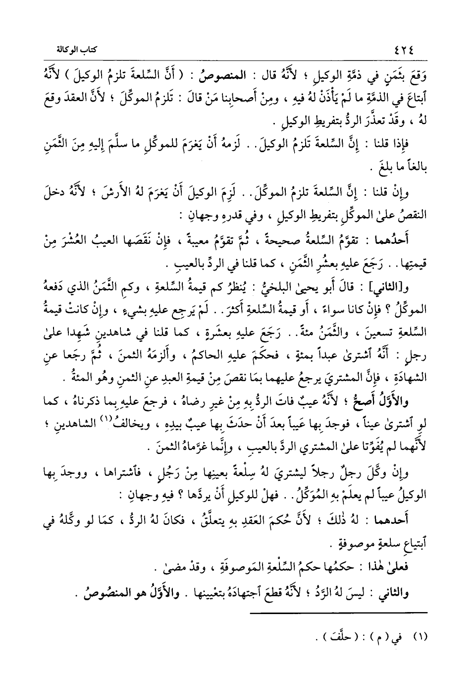 و [الثاني] : قال أبو يحيى البلخي: ينظر كم قيمة السلعة وكم الثمن الذي دفعه الموكل؟ فإن كانا سواء، أو قيمة السلعة أكثر.. لم يرجع عليه بشيء، وإن كانت قيمة السلعة تسعين، والثمن مائة.. رجع عليه بعشرة؛ كما قلنا في شاهدين شهدا على رجل: أنه اشترى عبدا بمائة، فحكم عليه الحاكم، وألزمه الثمن، ثم رجعا عن الشهادة، فإن المشتري يرجع عليهما بما نقص من قيمة العبد عن الثمن وهو المائة.