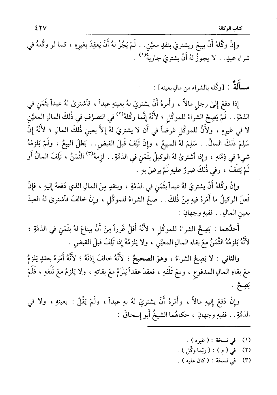 ] : إذا دفع إلى رجل مالا، وأمره أن يشتري له بعينه عبدا، فاشترى له عبدا بثمن في الذمة.. لم يصح الشراء للموكل؛ لأنه إنما وكله في التصرف في ذلك المال المعين لا في غيره، ولأن للموكل غرضا في أن لا يشتري له إلا بعين ذلك المال؛ لأنه إن سلم ذلك المال.. سلم له المبيع، وإن تلف قبل القبض.. بطل البيع، ولم يلزمه شيء في ذمته، وإذا اشترى له الوكيل بثمن في الذمة.. لزمه الثمن، تلف المال أو لم يتلف، وفي ذلك ضرر عليه لم يرض به.