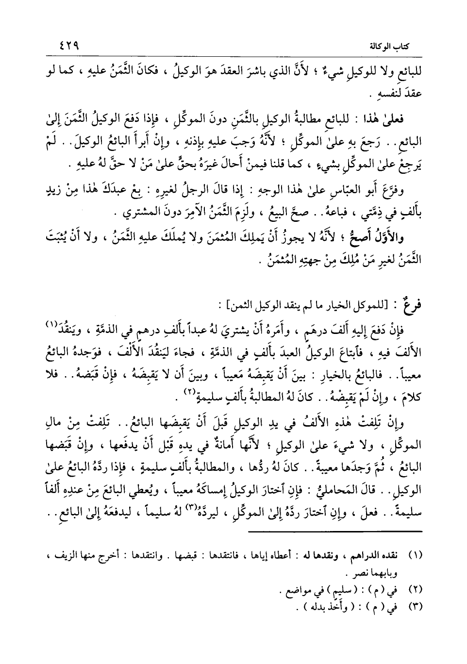 ] : فإن دفع إليه ألف درهم، وأمره أن يشتري له عبدا بألف درهم في الذمة. وينقد الألف فيه، فابتاع الوكيل العبد بألف في الذمة، فجاء لينقد الألف، فوجده البائع معيبا.. فالبائع بالخيار: بين أن يقبضه معيبا، وبين أن لا يقبضه، فإن قبضه.. فلا كلام، وإن لم يقبضه.. كان له المطالبة بألف سليمة.