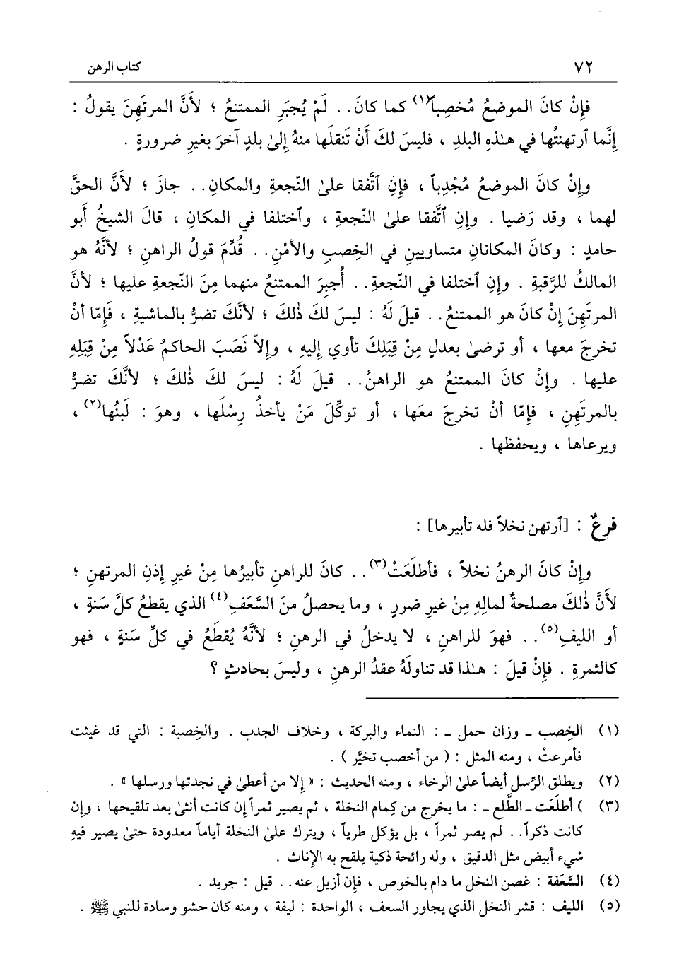 وإن كان الموضع مجدبا، فإن اتفقا على النجعة والمكان.. جاز؛ لأن الحق لهما، وقد رضيا. وإن اتفقا على النجعة، واختلفا في المكان، قال الشيخ أبو حامد: وكان المكانان متساويين في الخصب والأمن.. قدم قول الراهن؛ لأنه هو المالك للرقبة. وإن اختلفا في النجعة.. أجبر الممتنع منهما من النجعة عليها؛ لأن المرتهن إن كان هو الممتنع.. قيل له: ليس لك ذلك؛ لأنك تضر بالماشية، فإما أن تخرج معها، أو ترضى بعدل من قبلك تأوي إليه، وإلا نصب الحاكم عدلا من قبله عليها. وإن كان الممتنع هو الراهن.. قيل له: ليس لك ذلك؛ لأنك تضر بالمرتهن، فإما أن تخرج معها، أو توكل من يأخذ رسلها، وهو: لبنها، ويرعاها، ويحفظها.