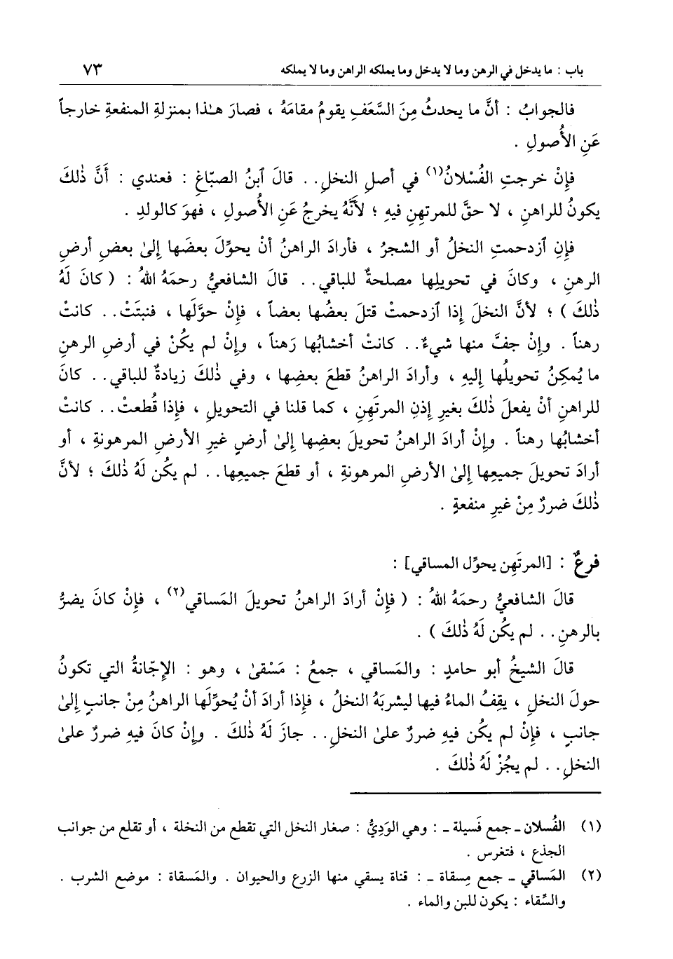 قال الشيخ أبو حامد: والمساقي، جمع: مسقى، وهو: الإجانة التي تكون حول النخل، يقف الماء فيها ليشربه النخل، فإذا أراد أن يحولها الراهن من جانب إلى جانب، فإن لم يكن فيه ضرر على النخل.. جاز له ذلك. وإن كان فيه ضرر على النخل.. لم يجز له ذلك.