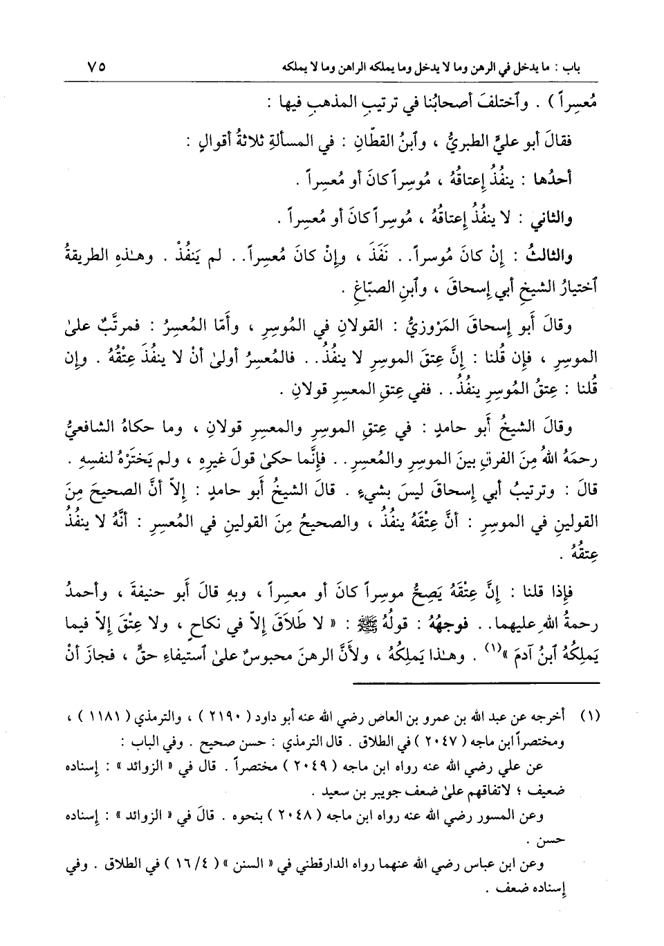 وقال الشيخ أبو حامد: في عتق الموسر والمعسر قولان، وما حكاه الشافعي - رَحِمَهُ اللَّهُ - من الفرق بين الموسر والمعسر.. فإنما حكى قول غيره، ولم يختره لنفسه. قال: وترتيب أبي إسحاق ليس بشيء. قال الشيخ أبو حامد: إلا أن الصحيح من القولين في الموسر: أن عتقه ينفذ، والصحيح من القولين في المعسر: أنه لا ينفذ عتقه.