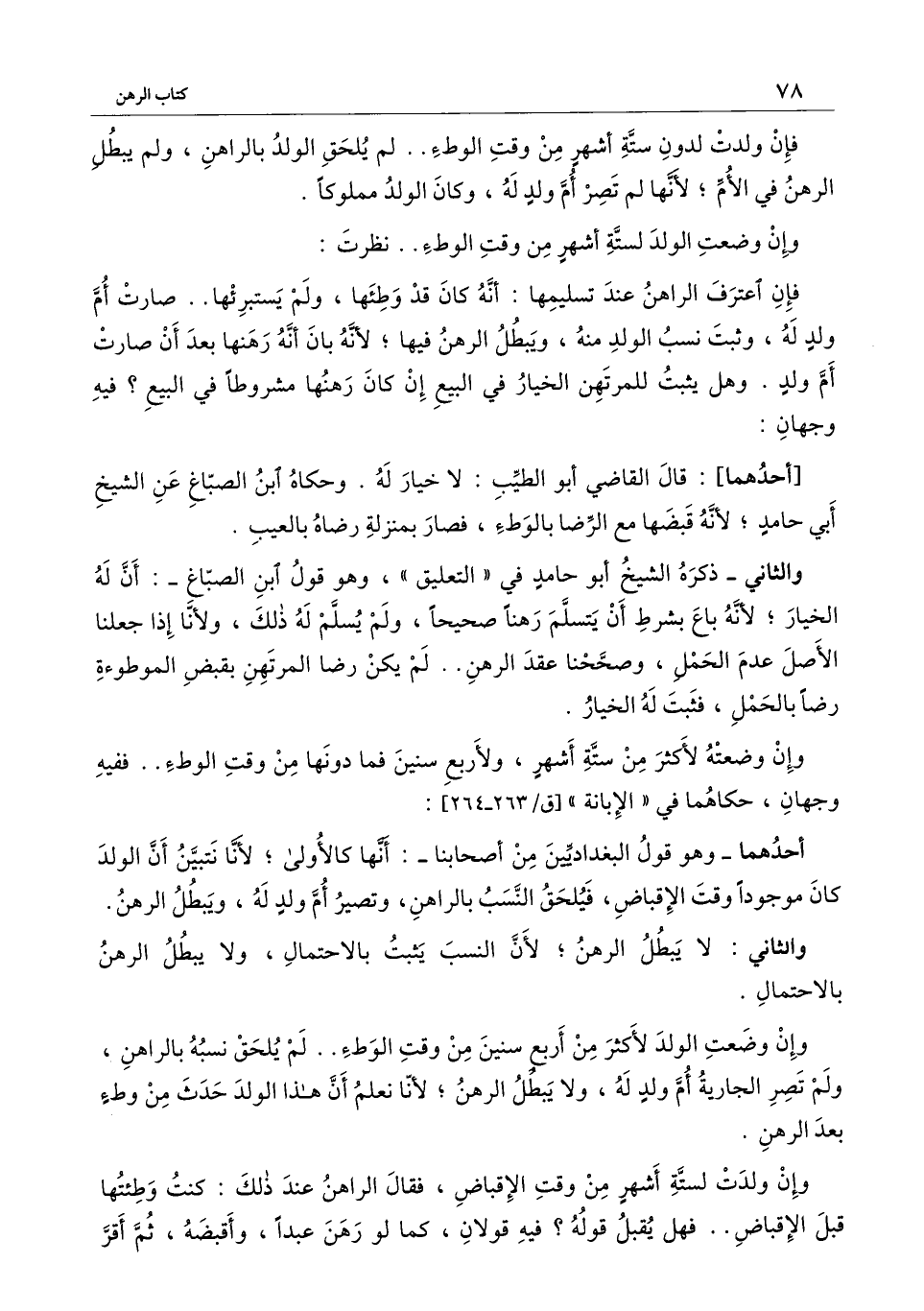 أحدهما ـ وهو قول البغداديين من أصحابنا ـ: أنها كالأولى؛ لأنا نتبين أن الولد كان موجودا وقت الإقباض، فيلحق النسب بالراهن، وتصير أم ولد له، ويبطل الرهن.