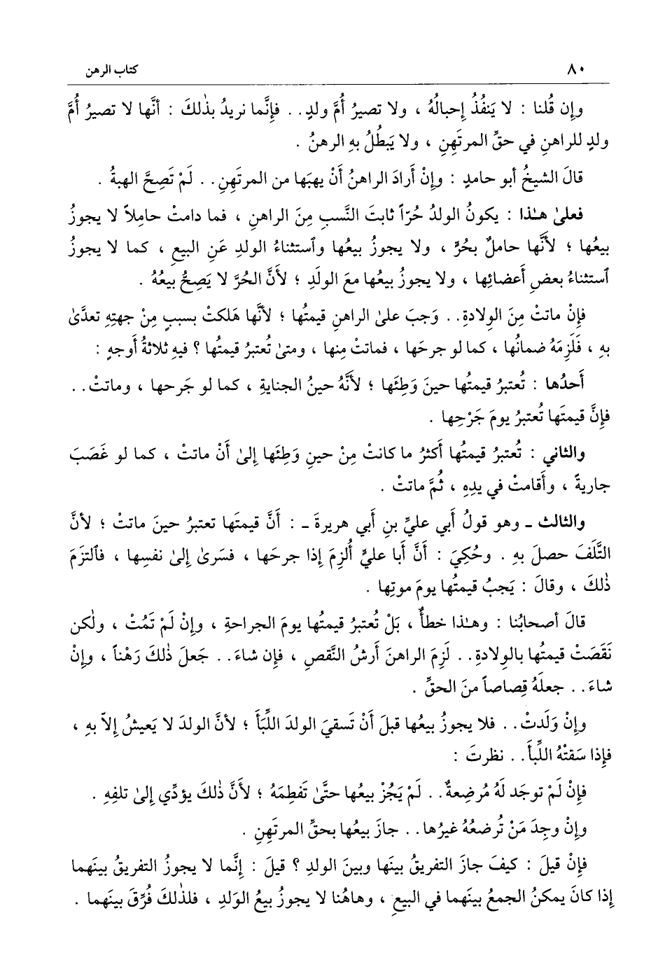 قال أصحابنا: وهذا خطأ، بل تعتبر قيمتها يوم الجراحة، وإن لم تمت، ولكن نقصت قيمتها بالولادة.. لزم الراهن أرش النقص، فإن شاء.. جعل ذلك رهنا، وإن شاء.. جعله قصاصا من الحق.