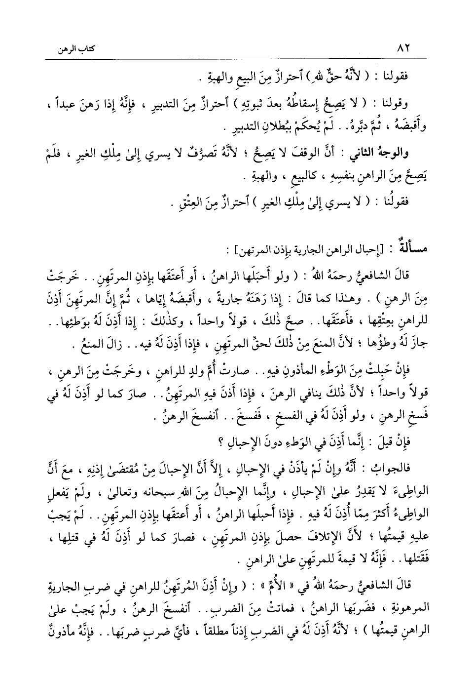 فالجواب: أنه وإن لم يأذن في الإحبال، إلا أن الإحبال من مقتضى إذنه، مع أن الواطئ لا يقدر على الإحبال، وإنما الإحبال من الله سبحانه وتعالى، ولم يفعل الواطئ أكثر مما أذن له فيه، فإذا أحبلها الراهن، أو أعتقها بإذن المرتهن.. لم يجب عليه قيمتها؛ لأن الإتلاف حصل بإذن المرتهن، فصار كما لو أذن له في قتلها، فقتلها.. فإنه لا قيمة للمرتهن على الراهن.
