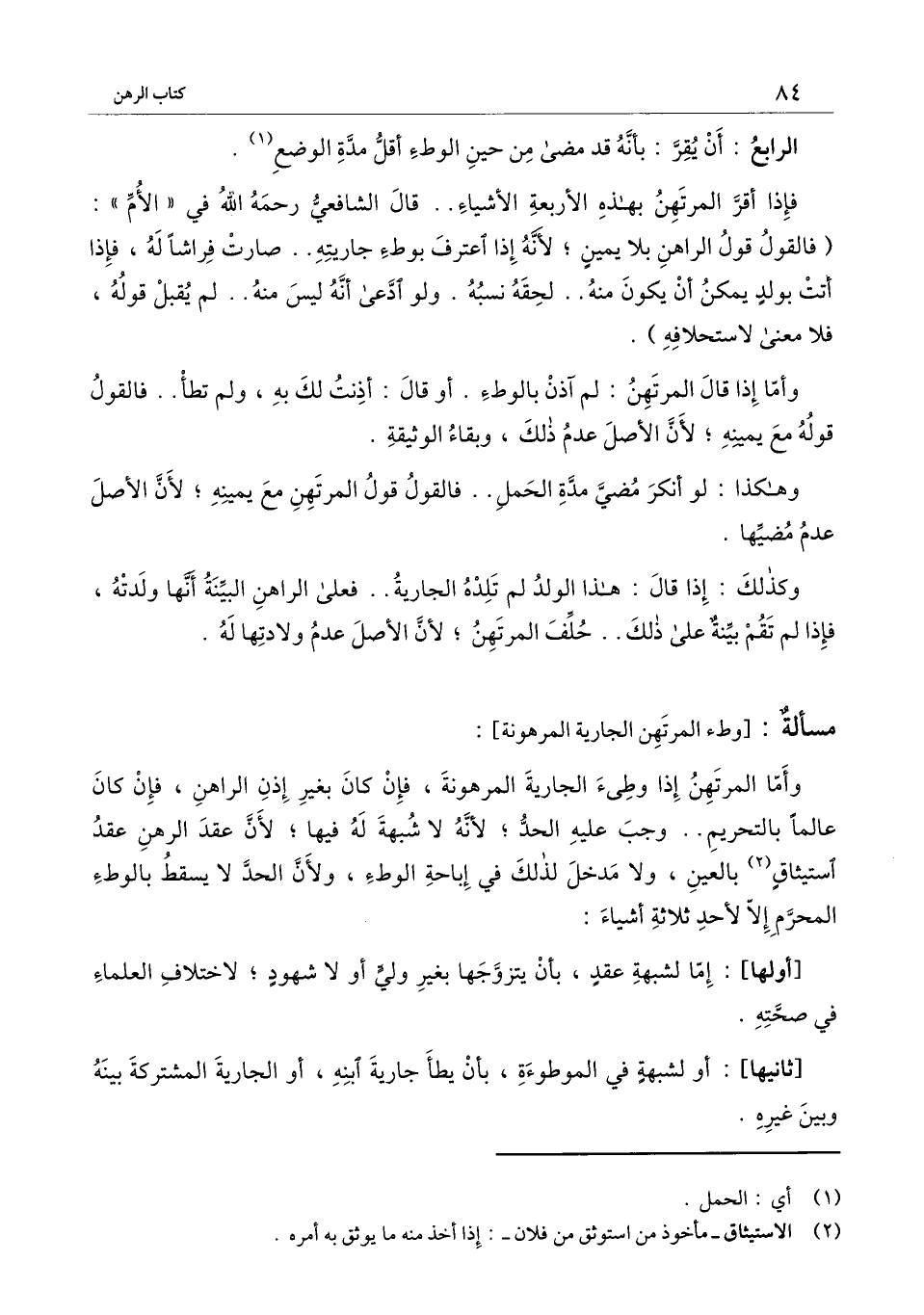 فإذا أقر المرتهن بهذه الأربعة الأشياء.. قال الشافعي - رَحِمَهُ اللَّهُ - في " الأم ": (فالقول قول الراهن بلا يمين؛ لأنه إذا اعترف بوطء جاريته.. صارت فراشا له، فإذا أتت بولد يمكن أن يكون منه.. لحقه نسبه. ولو ادعى أنه ليس منه.. لم يقبل قوله، فلا معنى لاستحلافه) .