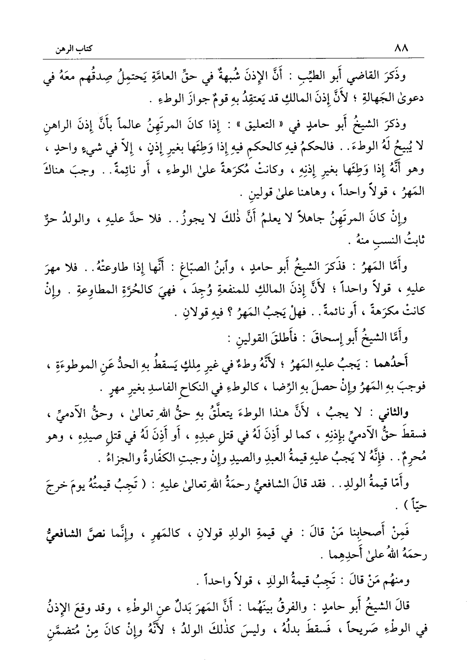 وذكر الشيخ أبو حامد في " التعليق ": إذا كان المرتهن عالما بأن إذن الراهن لا يبيح له الوطء.. فالحكم فيه كالحكم فيه إذا وطئها بغير إذن، إلا في شيء واحد، وهو أنه إذا وطئها بغير إذنه، وكانت مكرهة على الوطء، أو نائمة.. وجب هناك المهر، قولا واحدا، وهاهنا على قولين.