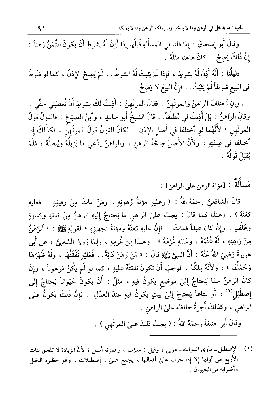 ] : قال الشافعي - رَحِمَهُ اللَّهُ -: (وعليه مؤنة رهونه، ومن مات من رقيقه.. فعليه كفنه) . وهذا كما قال: يجب على الراهن ما يحتاج إليه الرهن من نفقة وكسوة وعلف. وإن كان عبدا فمات.. فإن عليه كفنه ومؤنة تجهيزه؛ لقوله - صَلَّى اللَّهُ عَلَيْهِ وَسَلَّمَ -: «الرهن من راهنه، له غنمه، وعليه غرمه» . وهذا من غرمه ولما روى الشعبي، عن أبي هريرة - رَضِيَ اللَّهُ عَنْهُ -: أن النبي - صَلَّى اللَّهُ عَلَيْهِ وَسَلَّمَ - قال: «من رهن دابة.. فعليه نفقتها، وله ظهرها وحملها» ، ولأنه ملكه، فوجب أن تكون نفقته عليه، كما لو لم يكن مرهونا، وإن كان الرهن مما يحتاج إلى موضع يكون فيه، مثل: أن يكون حيوانا يحتاج إلى إصطبل، أو متاعا يحتاج إلى بيت يكون فيه عند العدل.. فإن ذلك يكون على الراهن، وكذلك أجرة حافظه على الراهن.