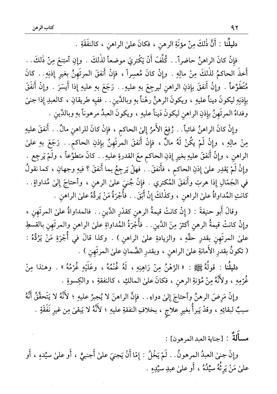 وإن كان الراهن غائبا.. رفع الأمر إلى الحاكم، فإن كان للراهن مال.. أنفق عليه من ماله، وإن لم يكن له مال، فإن أنفق المرتهن بإذن الحاكم.. رجع به على الراهن، وإن أنفق عليه بغير إذن الحاكم مع القدرة عليه.. كان متطوعا، ولم يرجع. وإن لم يقدر على إذن الحاكم، فأنفق.. فهل يرجع بما أنفق؟ فيه وجهان، كما نقول في الجمال إذا هرب وأنفق المكتري. فإن جني على الرهن، واحتاج إلى مداواة.. كانت المداواة على الراهن، وكذلك إن أبق.. فأجرة من يرده على الراهن.