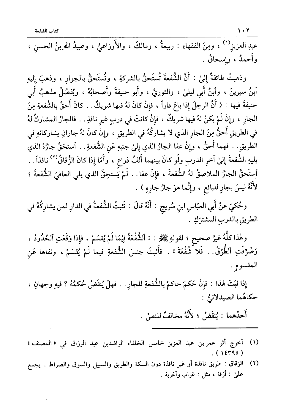 وذهبت طائفة إلى: أن الشفعة تستحق بالشركة، وتستحق بالجوار، وذهب إليه ابن سيرين، وابن أبي ليلى، والثوري، وأبو حنيفة وأصحابه، ويفصل مذهب أبي حنيفة فيها: (أن الرجل إذا باع داراً، فإن كان له فيها شريك.. كان أحق بالشفعة من الجار، وإن لم يكن له فيها شريك، فإن كانت في درب غير نافذ.. فالجار المشارك له في الطريق أحق من الجار الذي لا يشاركه في الطريق، وإن كان له جاران يشاركانه في الطريق.. فهما أحق، وإن عفا الجار الذي إلى جنبه عن الشفعة.. استحق جاره الذي يليه الشفعة إلى آخر الدرب ولو كان بينهما ألف ذراع، وأما إذا كان الزقاق نافذاً.. استحق الجار الملاصق له الشفعة، فإن عفا.. لم يستحق الذي يلي العافي الشفعة؛ لأنه ليس بجار للبائع، وإنما هو جار جاره) .