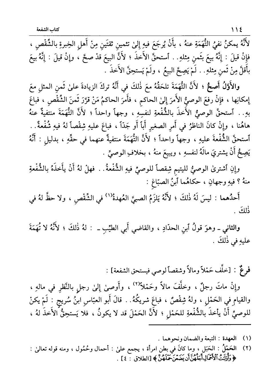 ] : وإن مات رجل، وخلف مالاً وحملاً، وأوصى إلى رجل بالنظر في ماله، والقيام في الحمل، وله شقص، فباع شريكه.. قال أبو العباس ابن سريج: لم يكن للوصي أن يأخذ بالشفعة للحمل؛ لأن الحمل قد لا يكون، فلا يستحق الأخذ له،