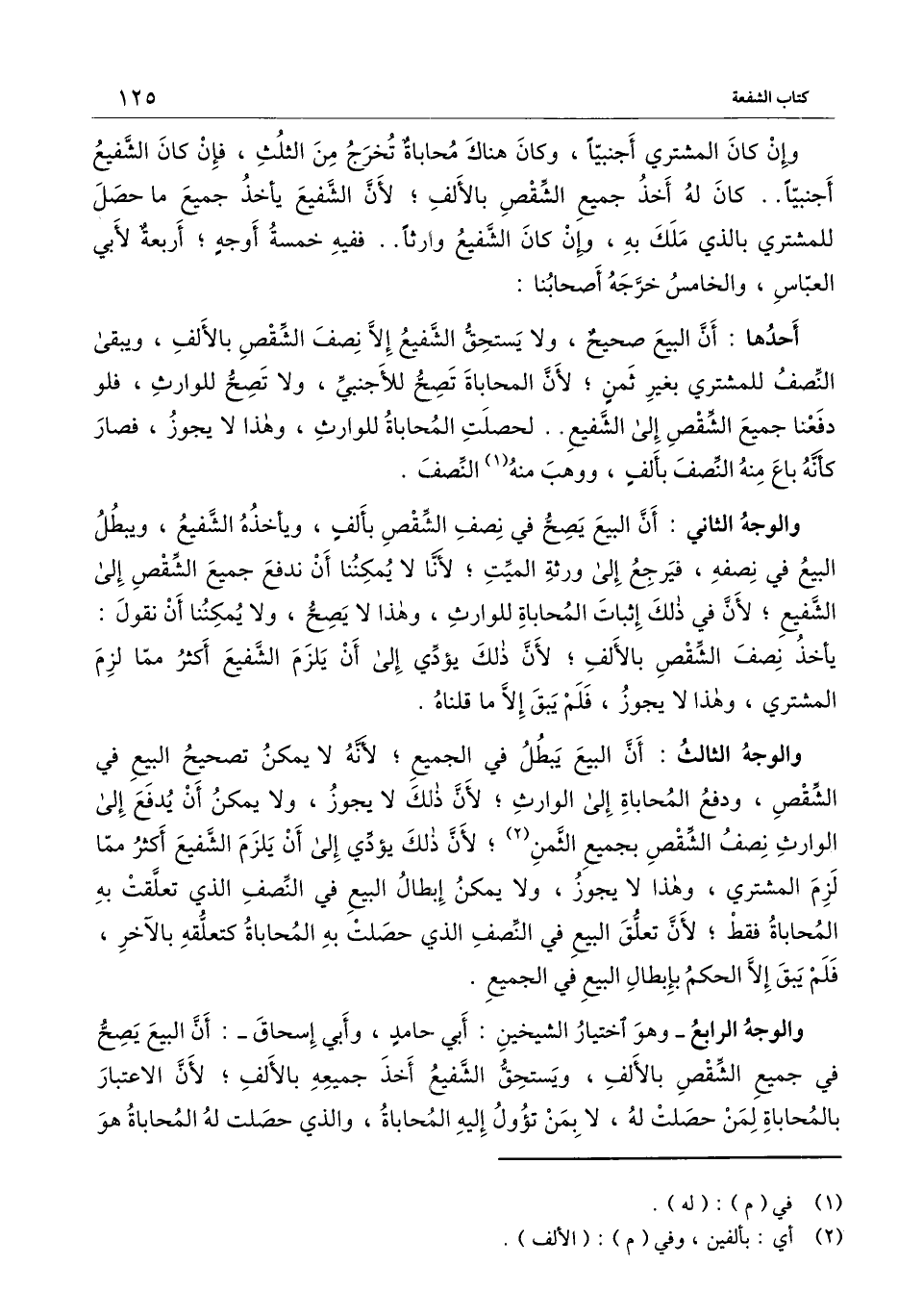 والوجه الرابع ـ وهو اختيار الشيخين: أبي حامد، وأبي إسحاق ـ: أن البيع يصح في جميع الشقص بالألف، ويستحق الشفيع أخذ جميعه بالألف؛ لأن الاعتبار بالمحاباة لمن حصلت له، لا بمن تؤول إليه المحاباة، والذي حصلت له المحاباة هو