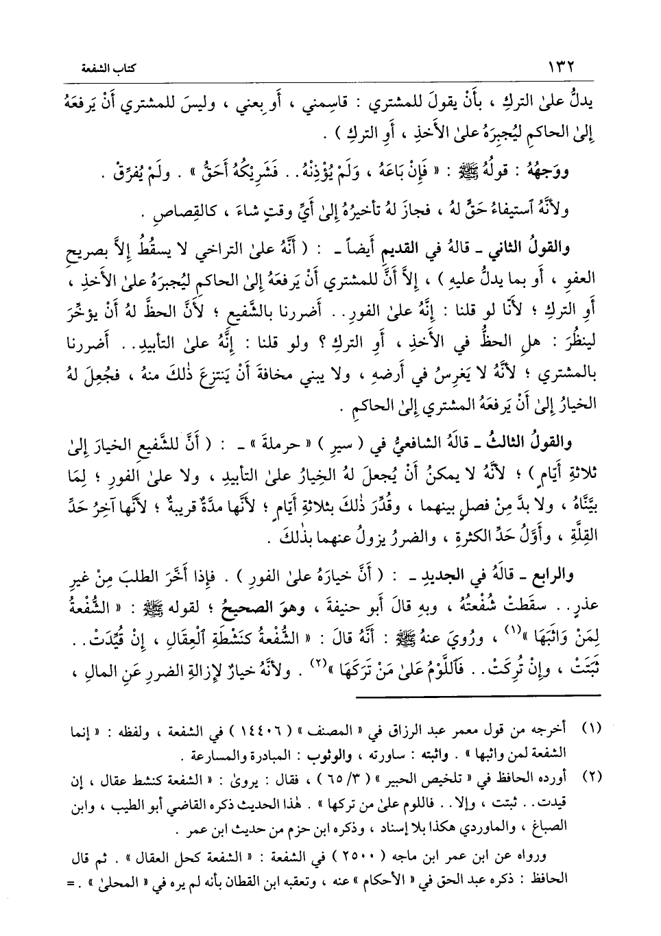 والرابع - قاله في الجديد -: (أن خياره على الفور) . فإذا أخر الطلب من غير عذر.. سقطت شفعته، وبه قال أبو حنيفة، وهو الصحيح؛ لقوله - صَلَّى اللَّهُ عَلَيْهِ وَسَلَّمَ -: «الشفعة لمن واثبها» ، وروي عنه - صَلَّى اللَّهُ عَلَيْهِ وَسَلَّمَ -: أنه قال: «الشفعة كنشطة العقال، إن قيدت.. ثبتت، وإن تركت فاللوم على من تركها» . ولأنه خيار لإزالة الضرر عن المال