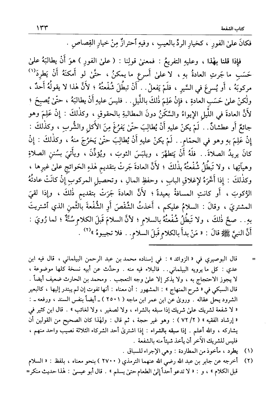 فإذا قلنا بهذا، وعليه التفريع: فمعنى قولنا: (على الفور) هو أن يطالبه على حسب ما جرت العادة به، لا على أسرع ما يمكن، حتى لو أمكنه أن يطرد مركوبه، أو يسرع في السير، فلم يفعل.. أن تبطل شفعته؛ لأن هذا لا يقوله أحد، ولكن على حسب العادة، فإن علم ذلك بالليل.. فليس عليه أن يطالبه، حتى يصبح؛ لأن العادة في الليل الإيواء والسكن دون المطالبة بالحقوق، وكذلك: إن علم وهو جائع أو عطشان.. لم يكن عليه أن يطالب حتى يفرغ من الأكل والشرب، وكذلك: إن علم به وهو في الحمام.. لم يكن عليه أن يطالب حتى يخرج منه، وكذلك: إن كان يريد الصلاة.. فله أن يتطهر، ويلبس الثوب، ويؤذن، ويأتي بسنن الصلاة وهيآتها، ولا تبطل شفعته بذلك؛ لأن العادة جرت بتقديم هذه الحوائج على غيرها، وكذلك: إذا أخره لإغلاق الباب، وحفظ المال، وتحصيل المركوب إن كانت عادته الركوب، أو كانت المسافة بعيدة؛ لأن العادة جرت بتقديم ذلك، وإذا لقي المشتري، وقال: السلام عليكم، أخذت الشقص أو الشفعة بالثمن الذي اشتريت به.. صح ذلك، ولا تبطل شفعته بالسلام؛ لأن السلام قبل الكلام سنة؛ لما روي: أن النبي - صَلَّى اللَّهُ عَلَيْهِ وَسَلَّمَ - قال: «من بدأ بالكلام قبل السلام.. فلا تجيبوه» .