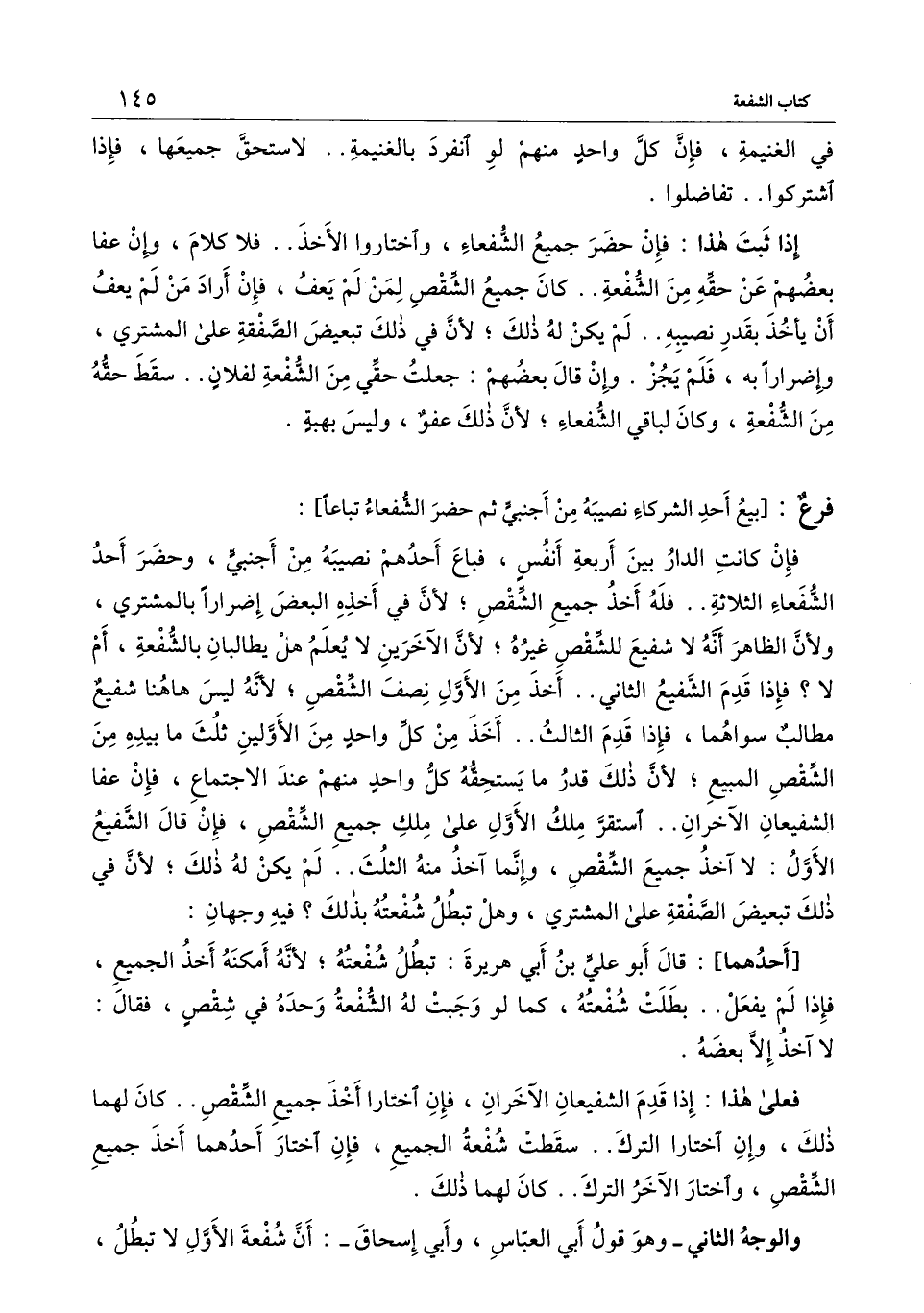 فإن كانت الدار بين أربعة أنفس، فباع أحدهم نصيبه من أجنبي، وحضر أحد الشفعاء الثلاثة.. فله أخذ جميع الشقص؛ لأن في أخذه البعض إضرارا بالمشتري، ولأن الظاهر أنه لا شفيع للشقص غيره؛ لأن الآخرين لا يعلم هل يطالبان بالشفعة، أم لا؟ فإذا قدم الشفيع الثاني.. أخذ من الأول نصف الشقص؛ لأنه ليس هاهنا شفيع مطالب سواهما، فإذا قدم الثالث.. أخذ من كل واحد من الأولين ثلث ما بيده من الشقص المبيع؛ لأن ذلك قدر ما يستحقه كل واحد منهم عند الاجتماع، فإن عفا الشفيعان الآخران.. استقر ملك الأول على ملك جميع الشقص، فإن قال الشفيع الأول: لا آخذ جميع الشقص، وإنما آخذ منه الثلث.. لم يكن له ذلك؛ لأن في ذلك تبعيض الصفقة على المشتري، وهل تبطل شفعته بذلك؟ فيه وجهان:
