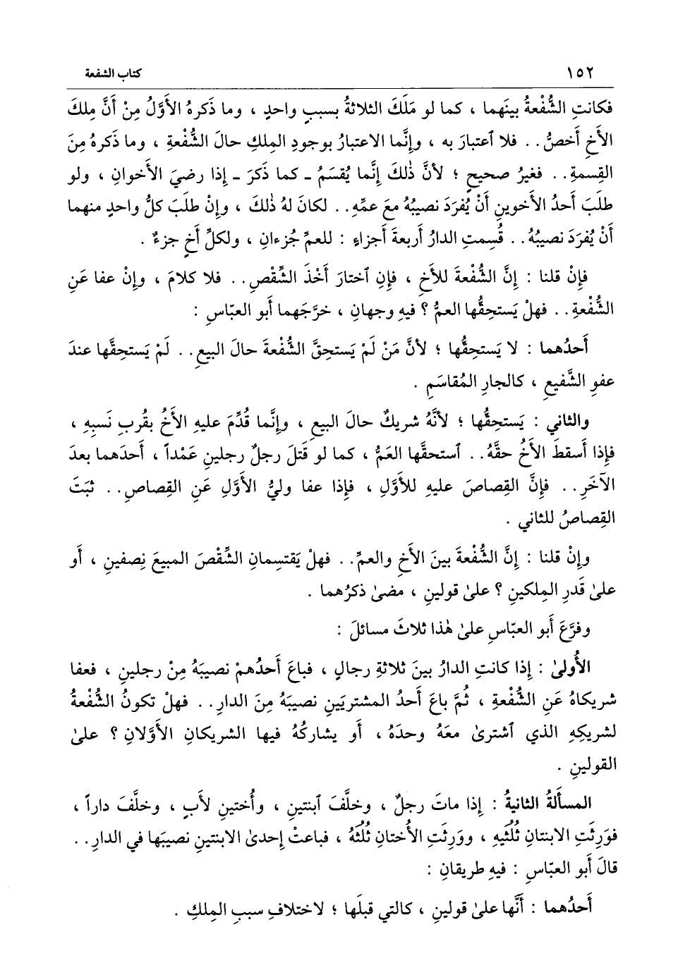 الأولى: إذا كانت الدار بين ثلاثة رجال، فباع أحدهم نصيبه من رجلين، فعفا شريكاه عن الشفعة، ثم باع أحد المشتريين نصيبه من الدار.. فهل تكون الشفعة لشريكه الذي اشترى معه وحده، أو يشاركه فيها الشريكان الأولان؟ على القولين.