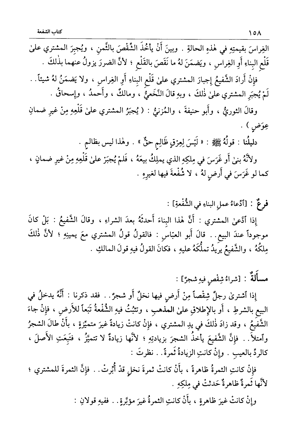 الغراس بقيمته في هذه الحالة. وبين أن يأخذ الشقص بالثمن، ويجبر المشتري على قلع البناء أو الغراس، ويضمن له ما نقص بالقلع؛ لأن الضرر يزول عنهما بذلك.