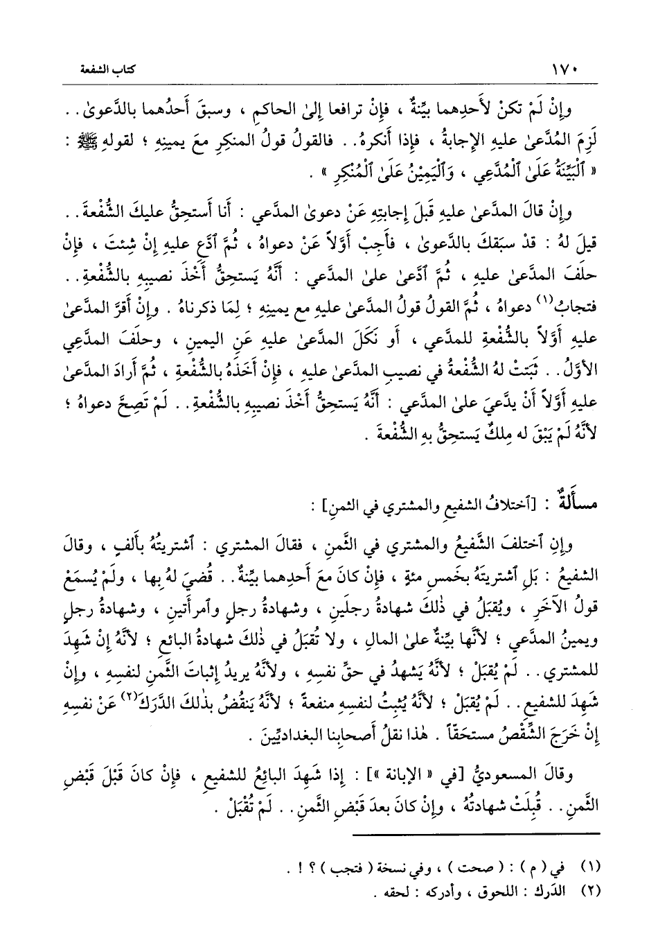 وإن قال المدعى عليه قبل إجابته عن دعوى المدعي: أنا استحق عليك الشفعة.. قيل له: قد سبقك بالدعوى، فأجب أولا عن دعواه، ثم ادع عليه إن شئت، فإن حلف المدعى عليه، ثم ادعى على المدعي: أنه يستحق أخذ نصيبه بالشفعة.. فتجاب دعواه، ثم القول قول المدعى عليه مع يمينه؛ لما ذكرناه. وإن أقر المدعى عليه أولا بالشفعة للمدعي، أو نكل المدعى عليه عن اليمين، وحلف المدعي الأول.. ثبتت له الشفعة في نصيب المدعى عليه، فإن أخذه بالشفعة، ثم أراد المدعى عليه أولا أن يدعي على المدعي: أنه يستحق أخذ نصيبه بالشفعة.. لم تصح دعواه؛ لأنه لم يبق له ملك يستحق به الشفعة.