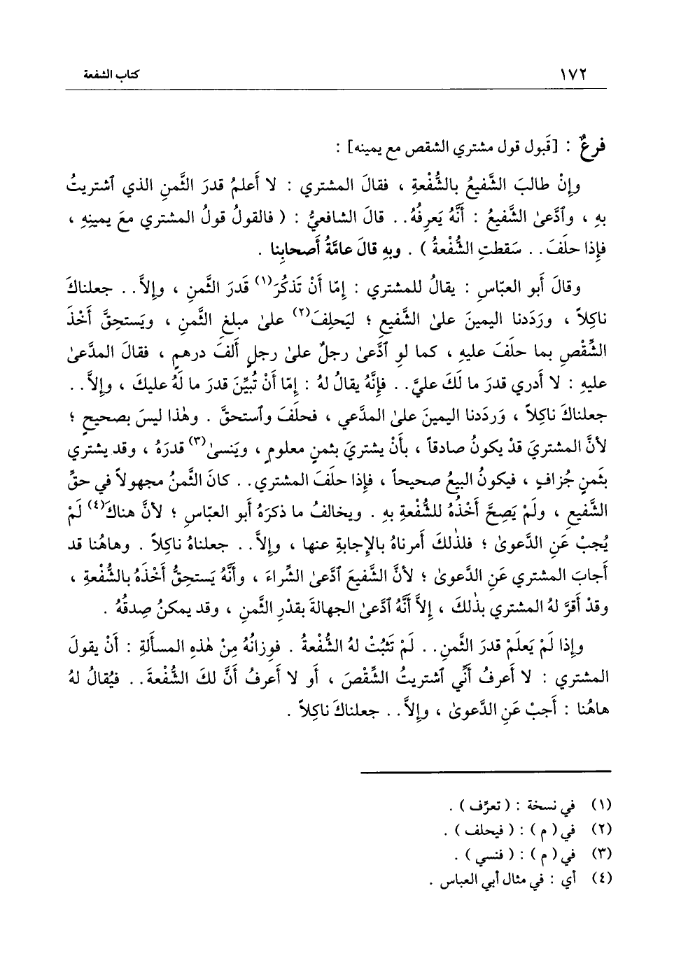 وقال أبو العباس: يقال للمشتري: إما أن تذكر قدر الثمن، وإلا.. جعلناك ناكلا، ورددنا اليمين على الشفيع؛ ليحلف على مبلغ الثمن، ويستحق أخذ الشقص بما حلف عليه، كما لو ادعى رجل على رجل ألف درهم، فقال المدعى عليه: لا أدري قدر ما لك علي.. فإنه يقال له: إما أن تبين قدر ما له عليك، وإلا جعلناك ناكلا، ورددنا اليمين على المدعي، فحلف واستحق. وهذا ليس بصحيح؛ لأن المشتري قد يكون صادقا بأن يشتري بثمن معلوم، وينسى قدره، وقد يشتري بثمن جزاف، فيكون البيع صحيحا، فإذا حلف المشتري.. كان الثمن مجهولا في حق الشفيع، ولم يصح أخذه للشفعة به. ويخالف ما ذكره أبو العباس؛ لأن هناك لم يجب عن الدعوى؛ فلذلك أمرناه بالإجابة عنها، وإلا.. جعلناه ناكلا. وهاهنا قد أجاب المشتري عن الدعوى؛ لأن الشفيع ادعى الشراء، وأنه يستحق أخذه بالشفعة، وقد أقر له المشتري بذلك، إلا أنه ادعى الجهالة بقدر الثمن، وقد يمكن صدقه.