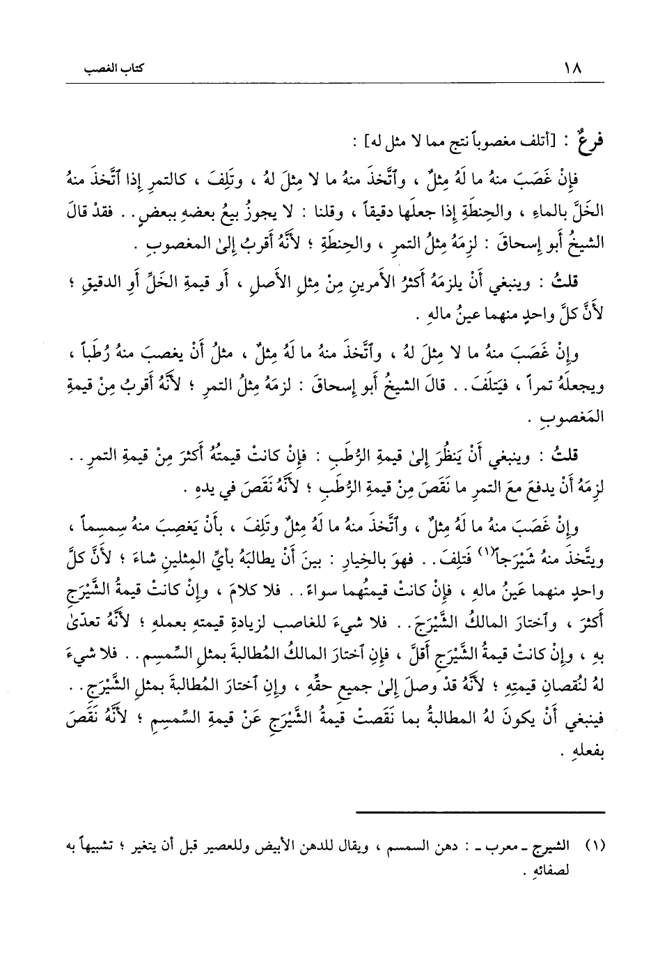 وإن غصب منه ما له مثل، واتخذ منه ما له مثل وتلف، بأن يغصب منه سمسماً، ويتخذ منه شيرجا فتلف.. فهو بالخيار: بين أن يطالبه بأي المثلين شاء؛ لأن كل واحد منهما عين ماله، فإن كانت قيمتهما سواء.. فلا كلام، وإن كانت قيمة الشيرج أكثر، واختار المالك الشيرج.. فلا شيء للغاصب لزيادة قيمته بعمله؛ لأنه تعدى به، وإن كانت قيمة الشيرج أقل، فإن اختار المالك المطالبة بمثل السمسم.. فلا شيء له لنقصان قيمته؛ لأنه قد وصل إلى جميع حقه، وإن اختار المطالبة بمثل الشيرج.. فينبغي أن يكون له المطالبة بما نقصت قيمة الشيرج عن قيمة السمسم؛ لأنه نقص بفعله.