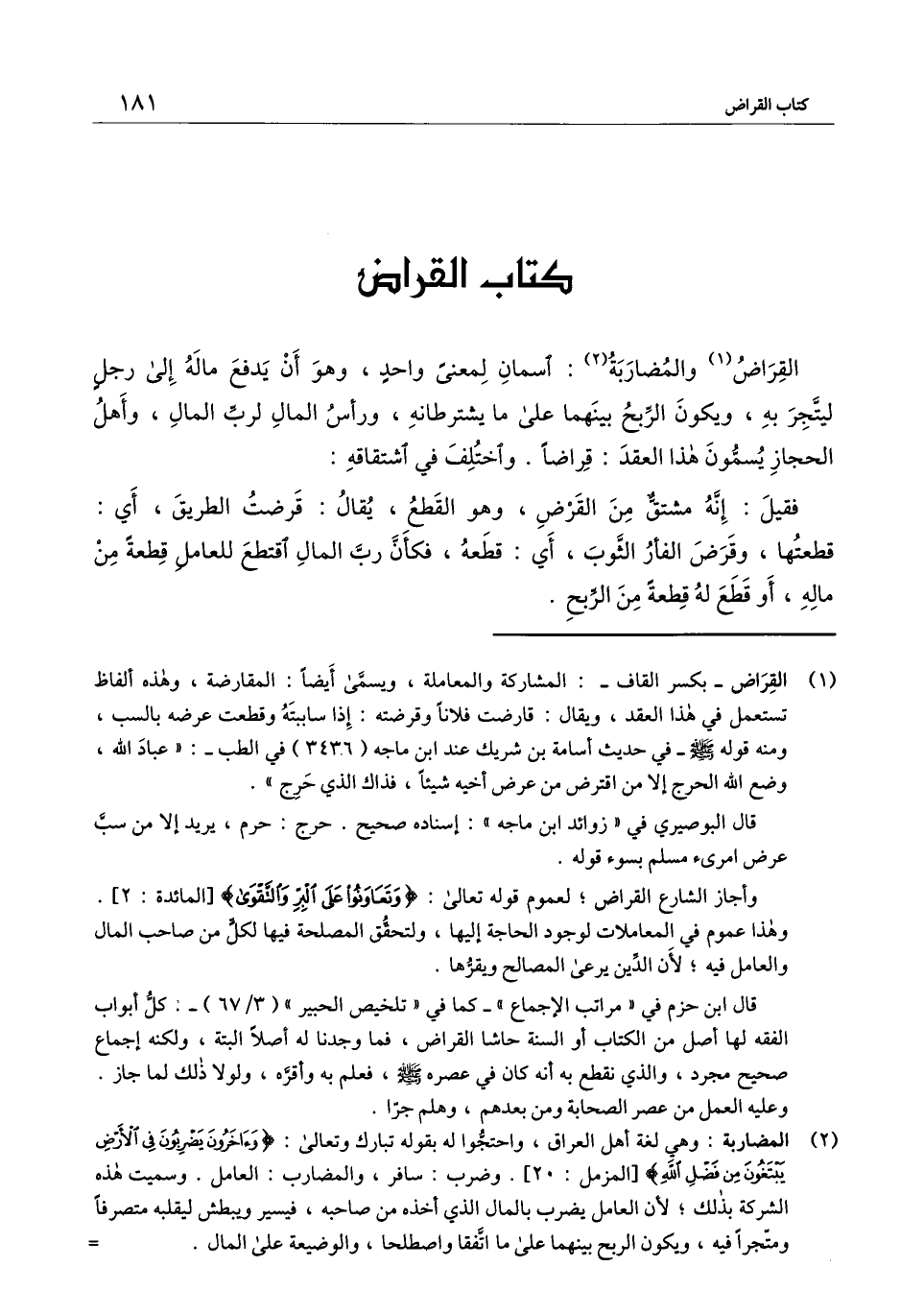 كتاب القراض القراض والمضاربة: اسمان لمعنى واحد، وهو أن يدفع ماله إلى رجل ليتجر به، ويكون الربح بينهما على ما يشترطانه، ورأس المال لرب المال، وأهل الحجاز يسمون هذا العقد: قراضا. واختلف في اشتقاقه: