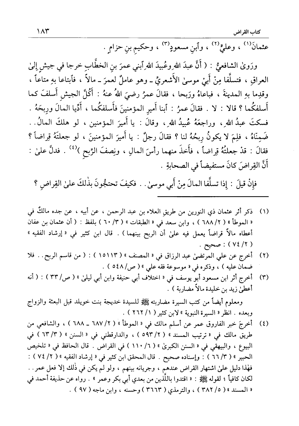 وروى الشافعي: (أن عبد الله وعبيد الله ابني عمر بن الخطاب خرجا في جيش إلى العراق، فتسلفا من أبي موسى الأشعري - وهو عامل لعمر - مالا، فابتاعا به متاعا، وقدما به المدينة، فباعاه وربحا، فقال عمر - رَضِيَ اللَّهُ عَنْهُ -: أكل الجيش أسلف كما أسلفكما؟ قالا: لا. فقال عمر: ابنا أمير المؤمنين فأسلفكما، أديا المال وربحه. فسكت عبد الله، وراجعه عبيد الله، وقال: يا أمير المؤمنين، لو هلك المال.. ضمناه، فلم لا يكون ربحه لنا؟ فقال رجل: يا أمير المؤمنين، لو جعلته قراضا؟ فقال: قد جعلته قراضا، فأخذ منهما رأس المال، ونصف الربح) . فدل على أن القراض كان مستفيضا في الصحابة.