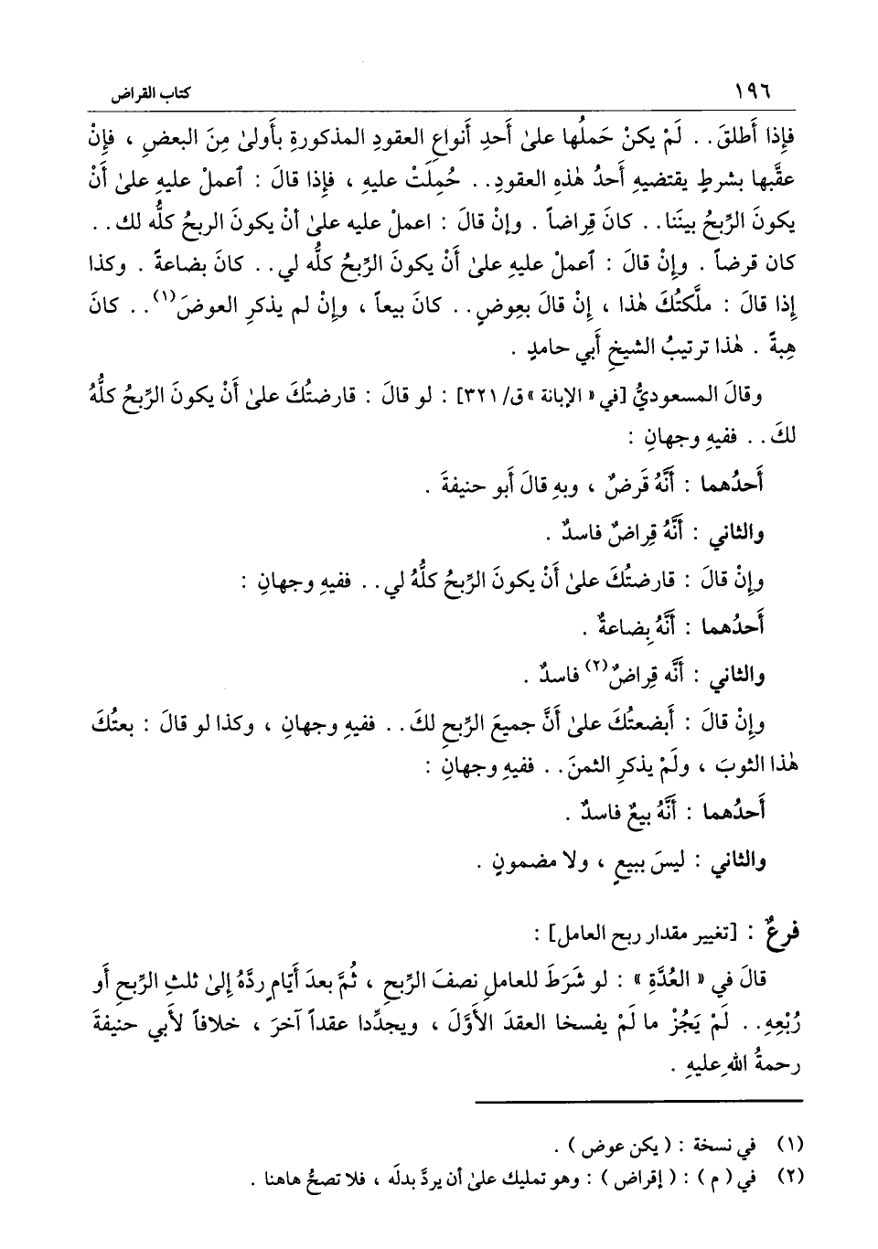 قال في (العدة) : لو شرط للعامل نصف الربح، ثم بعد أيام رده إلى ثلث الربح أو ربعه.. لم يجز ما لم يفسخا العقد الأول، ويجددا عقدا آخر، خلافا لأبي حنيفة رحمة الله عليه.