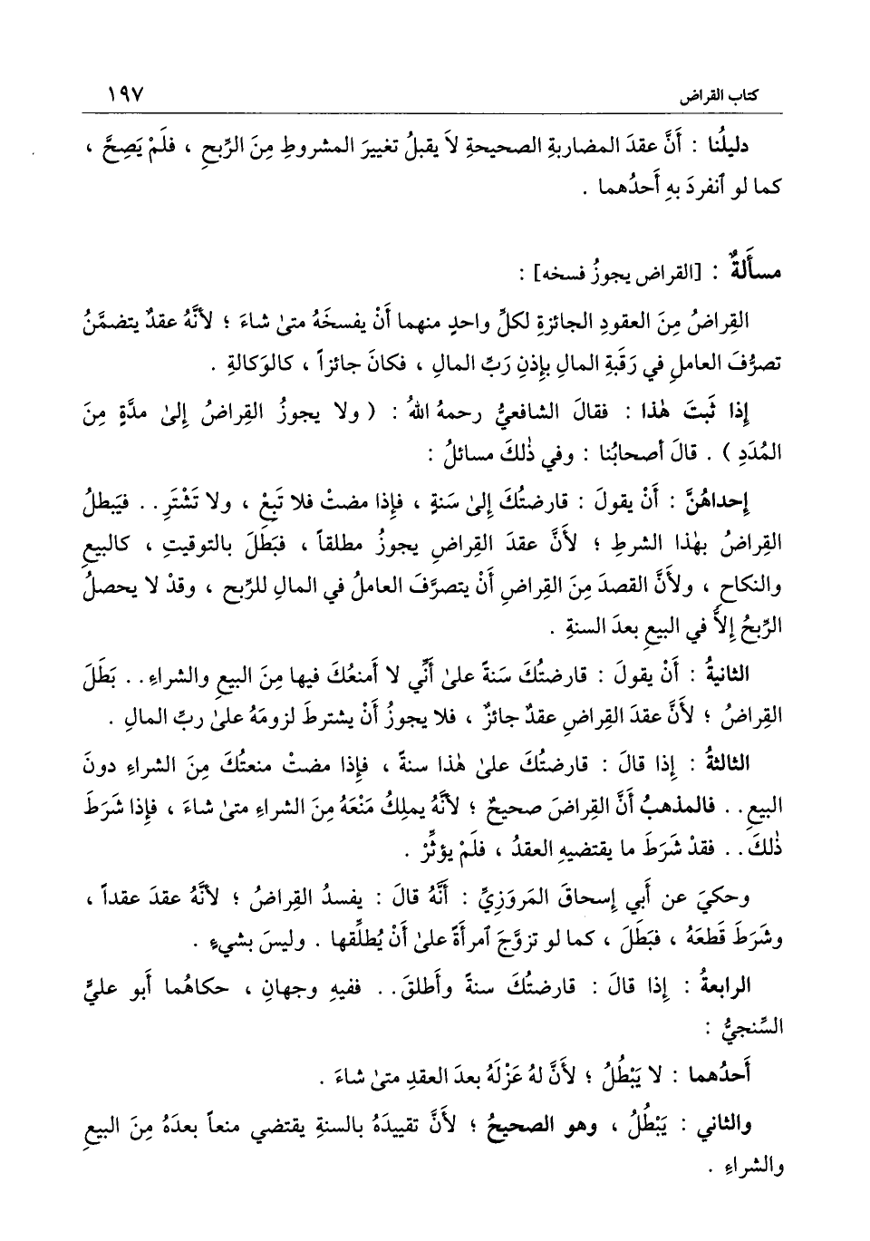 إحداهن: أن يقول: قارضتك إلى سنة، فإذا مضت فلا تبع، ولا تشتر.. فيبطل القراض بهذا الشرط؛ لأن عقد القراض يجوز مطلقا، فبطل بالتوقيت، كالبيع والنكاح، ولأن القصد من القراض أن يتصرف العامل في المال للربح، وقد لا يحصل الربح إلا في البيع بعد السنة.