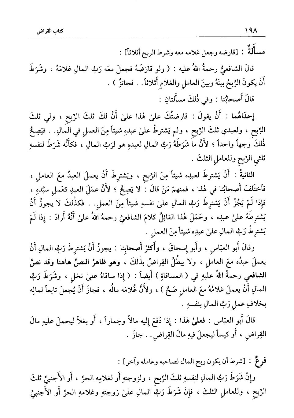 وقال أبو العباس، وأبو إسحاق، وأكثر أصحابنا: يجوز أن يشترط رب المال أن يعمل عبده مع العامل، ولا يبطل القراض بذلك، وهو ظاهر النص هاهنا وقد نص الشافعي رحمة الله عليه في (المساقاة) أيضا: (إذا ساقاه على نخل، وشرط رب المال أن يعمل غلامه مع العامل صح) ، ولأن غلامه ماله، فجاز أن يجعل تابعا لماله بخلاف عمل رب المال بنفسه. قال أبو العباس: فعلى هذا: إذا دفع إليه مالا وحمارا، أو بغلا ليحمل عليه مال القراض، أو كيسا ليجعل فيه مال القراض.. جاز.