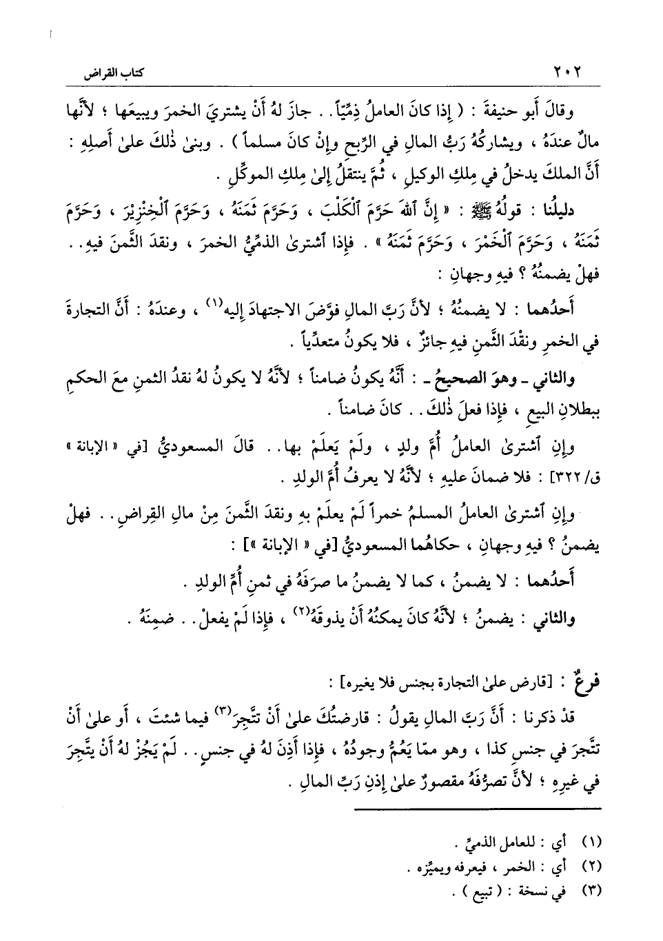 وقال أبو حنيفة: (إذا كان العامل ذميا.. جاز له أن يشتري الخمر ويبيعها؛ لأنها مال عنده، ويشاركه رب المال في الربح وإن كان مسلما) . وبنى ذلك على أصله: أن الملك يدخل في ملك الوكيل، ثم ينتقل إلى ملك الموكل.