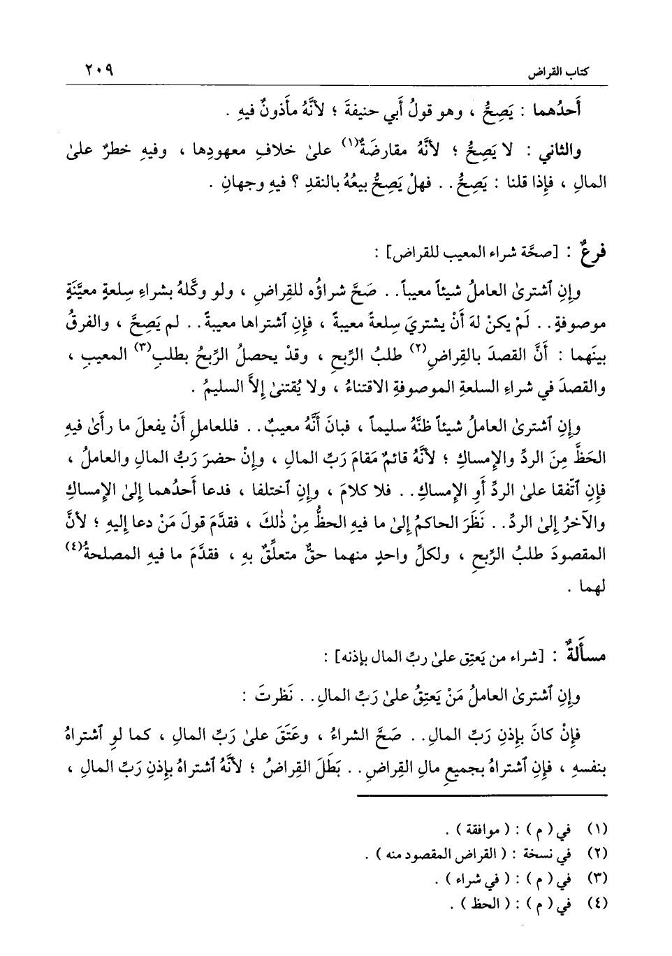 وإن اشترى العامل شيئا ظنه سليما، فبان أنه معيب.. فللعامل أن يفعل ما رأى فيه الحظ من الرد والإمساك؛ لأنه قائم مقام رب المال، وإن حضر رب المال والعامل، فإن اتفقا على الرد أو الإمساك.. فلا كلام وإن اختلفا، فدعا أحدها إلى الإمساك والآخر إلى الرد.. نظر الحاكم إلى ما فيه الحظ من ذلك، فقدم قول من دعا إليه؛ لأن المقصود طلب الربح، ولكل واحد منهما حق متعلق به، فقدم ما فيه المصلحة لهما.